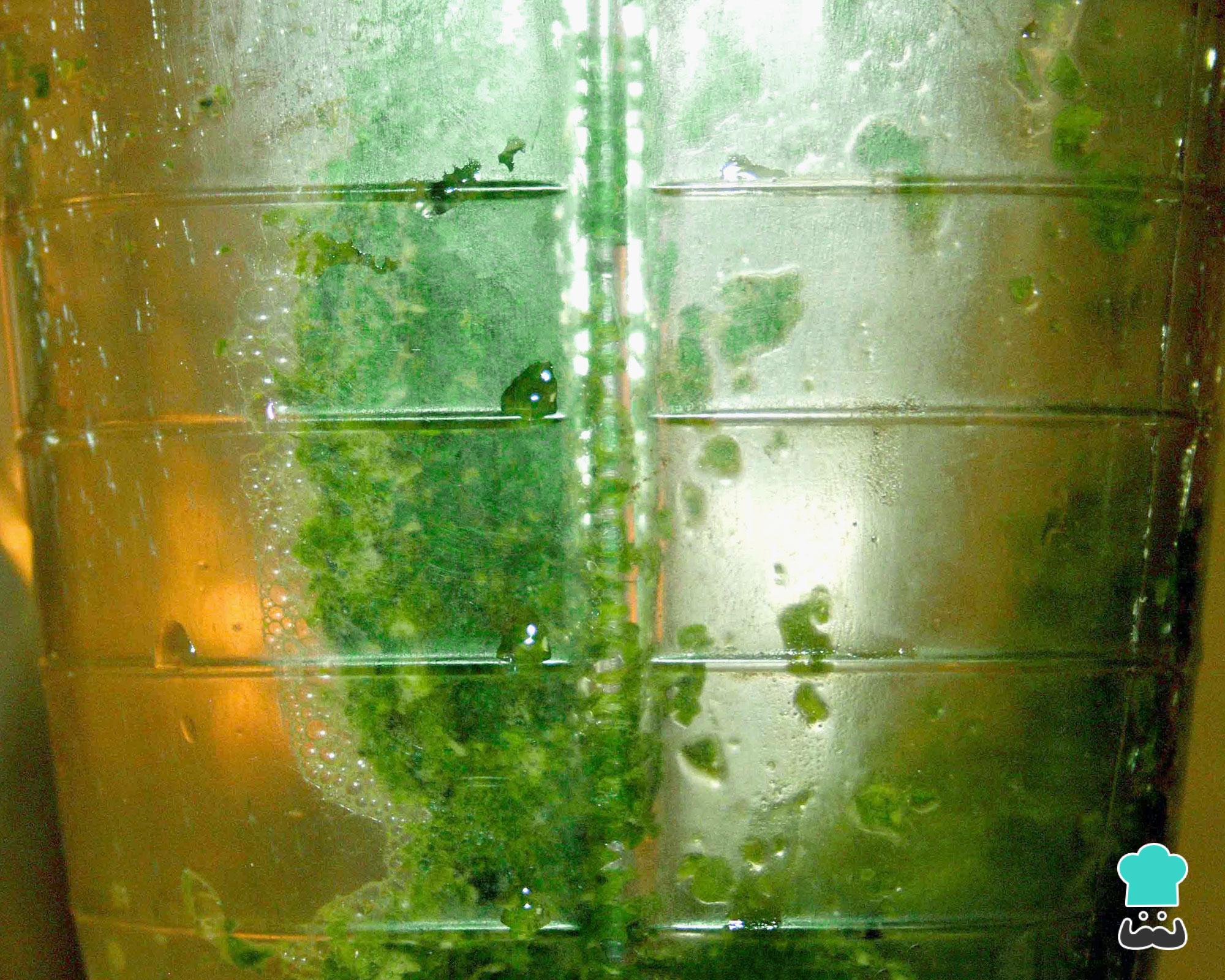 Finalmente, para a camada verde, bata no liquidificador os espinafres com o aipo e a última banana. Mais uma vez coloque um pouco de água para a batida ficar cremosa e homogênea.