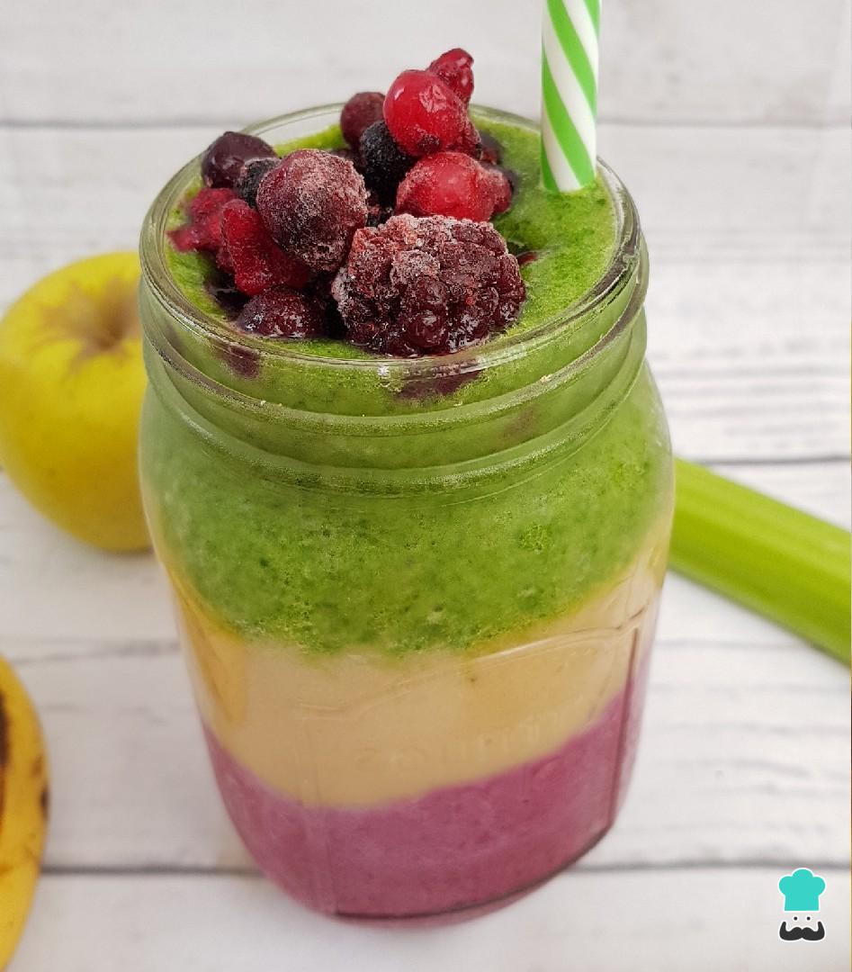 Para preparar este smoothie em três camadas é necessário usar diferentes frutas e vegetais com diferentes cores. Neste caso usamos espinafre e aipo para a cor verde, frutas vermelhas para a cor vermelha, e pera, maçã e gengibre para a cor amarela. Acrescentamos também banana congelada para conferir cremosidade e fibras em cada uma dessas camadas de cor e sabor. O resultado é uma receita de vitamina de banana com espinafre simplesmente deliciosa!