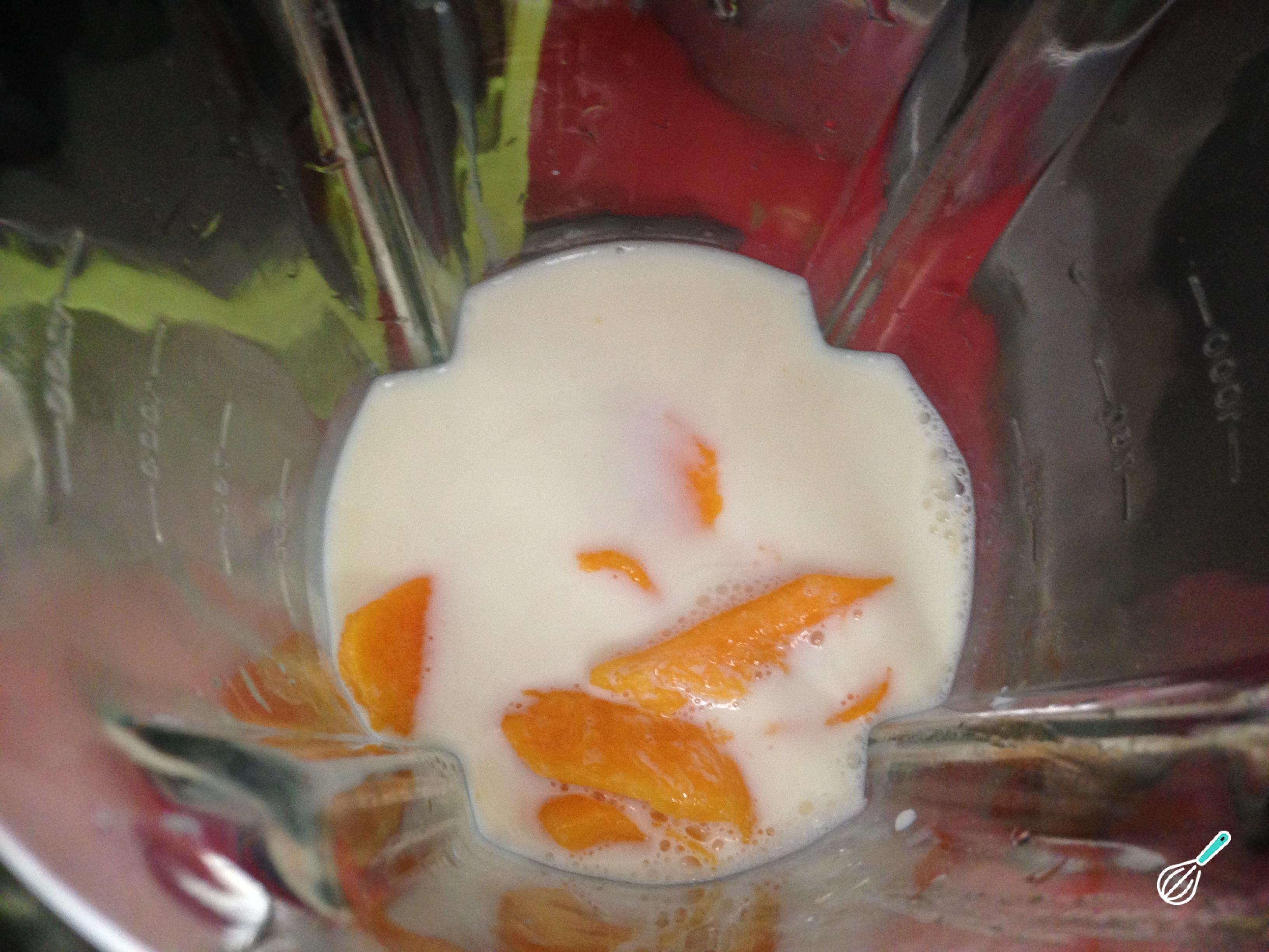 Coloque as mangas no liquidificador junto com o leite e o adoçante. Adoce a gosto esta vitamina de manga.