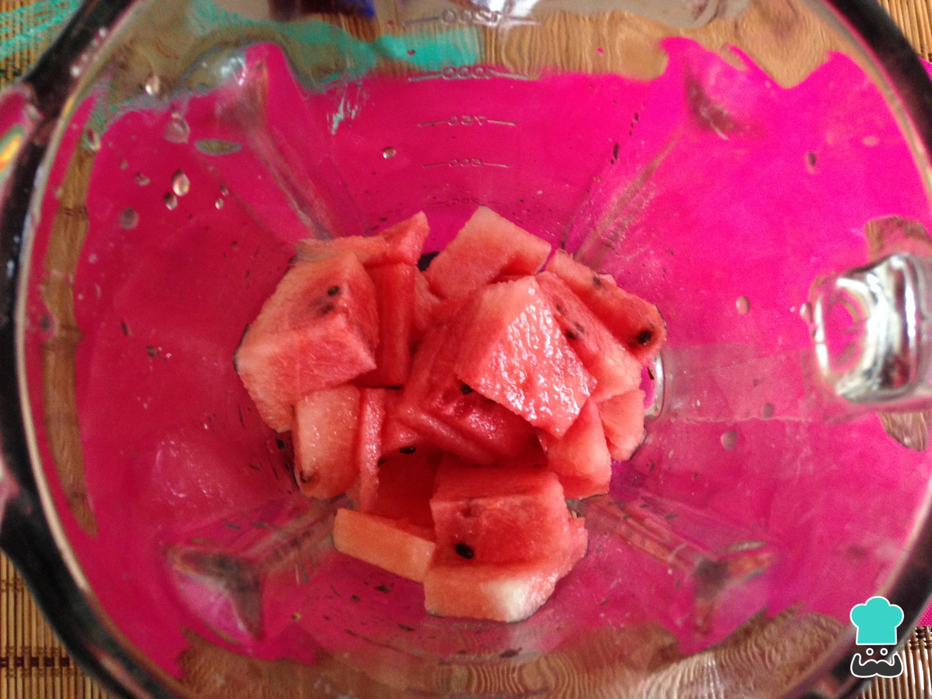 Descasque a melancia e corte-a em cubos. Bata no liquidificador, coe e volte a colocar o suco no liquidificador.