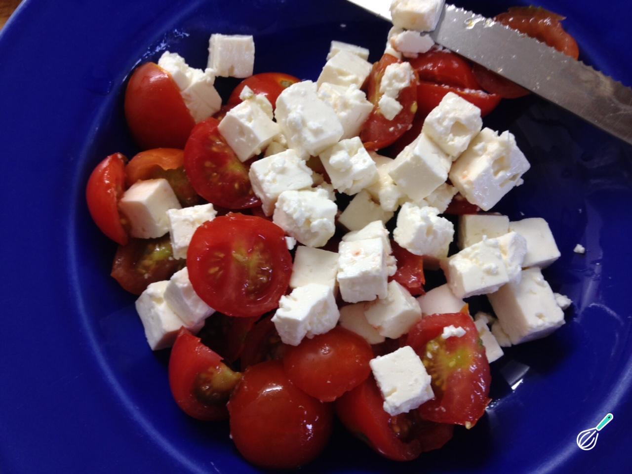 Em seguida corte o queijo feta em cubinhos e os tomates em metades. Coloque ambos os ingredientes numa tigela e reserve.