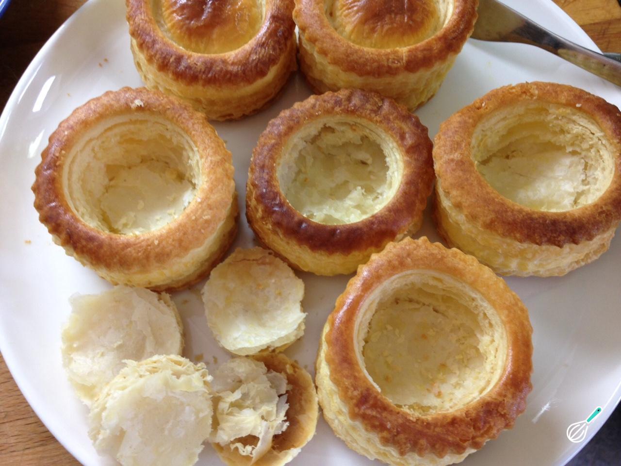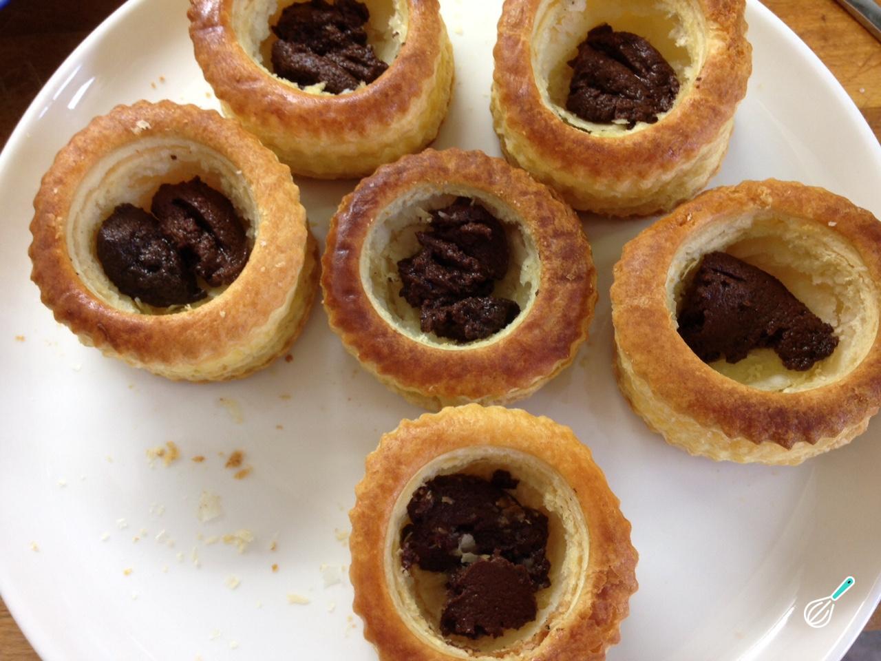 Prepare os vol-au-vent para rechear, seguindo as instruções na embalagem. No meu caso bastou colocar alguns minutinhos no microondas e, em seguida, com uma faca, retirei a parte de dentro.