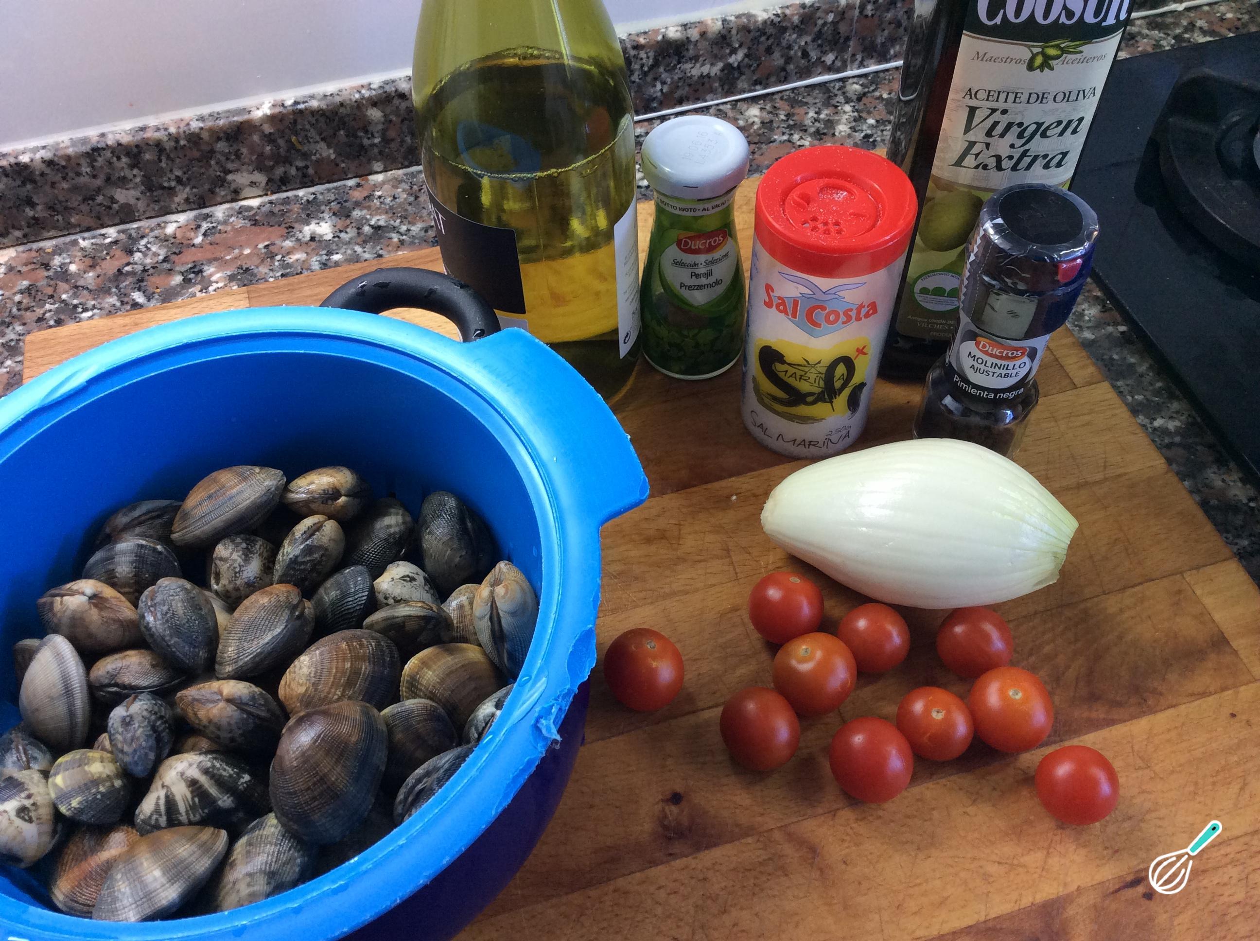Aqui temos os ingredientes para os vôngoles. Decidi usar a parte branca de uma cebolinha verde, mas você pode substituir por cebola. A este prato vamos também juntar tomate cereja.