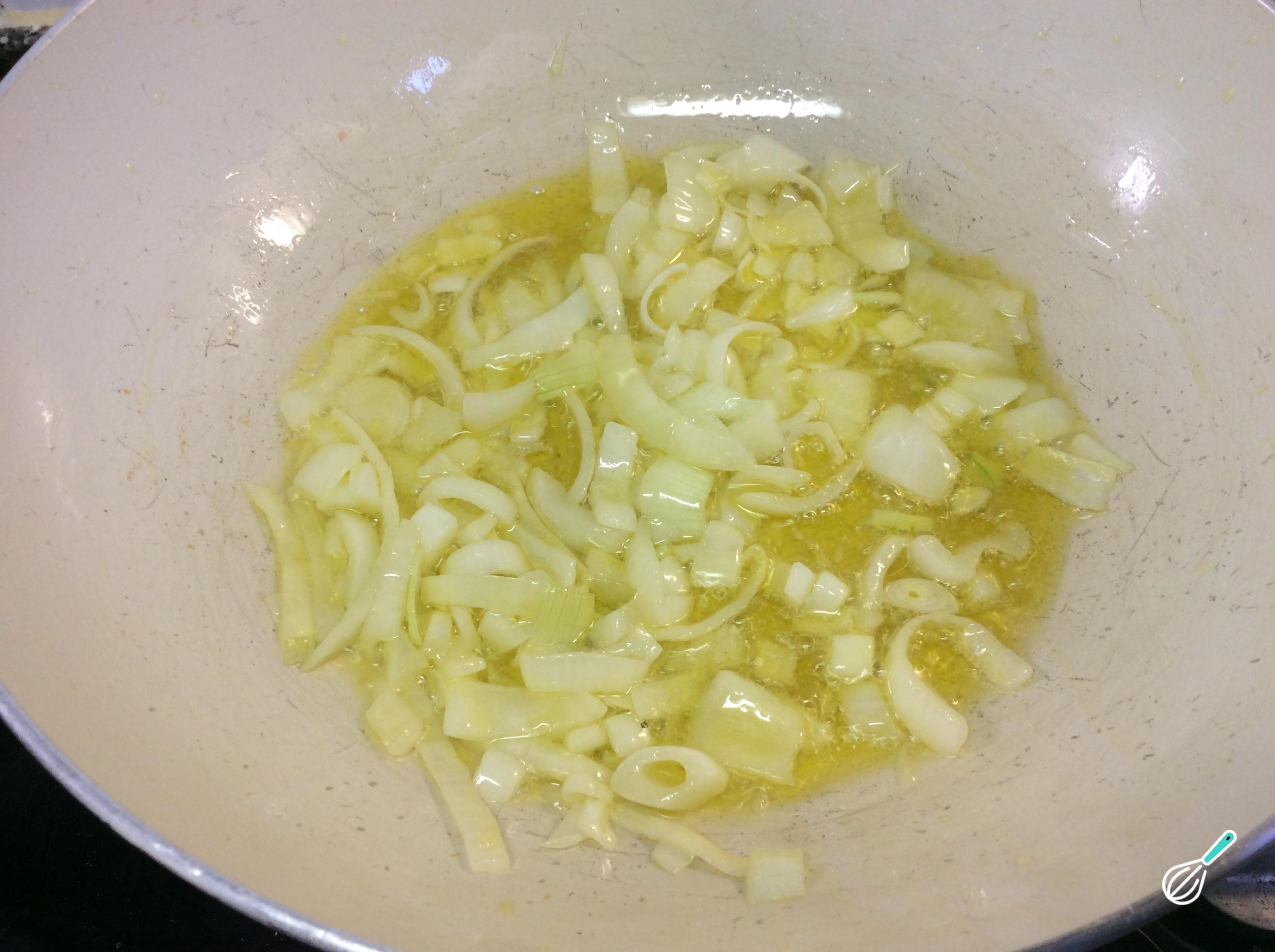 Numa panela, com uma quantidade generosa de azeite extra virgem, refogue a cebolinha previamente picada.