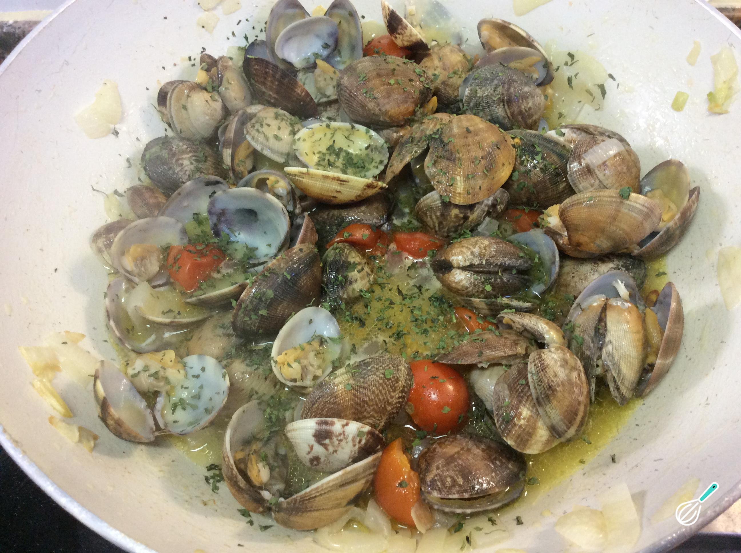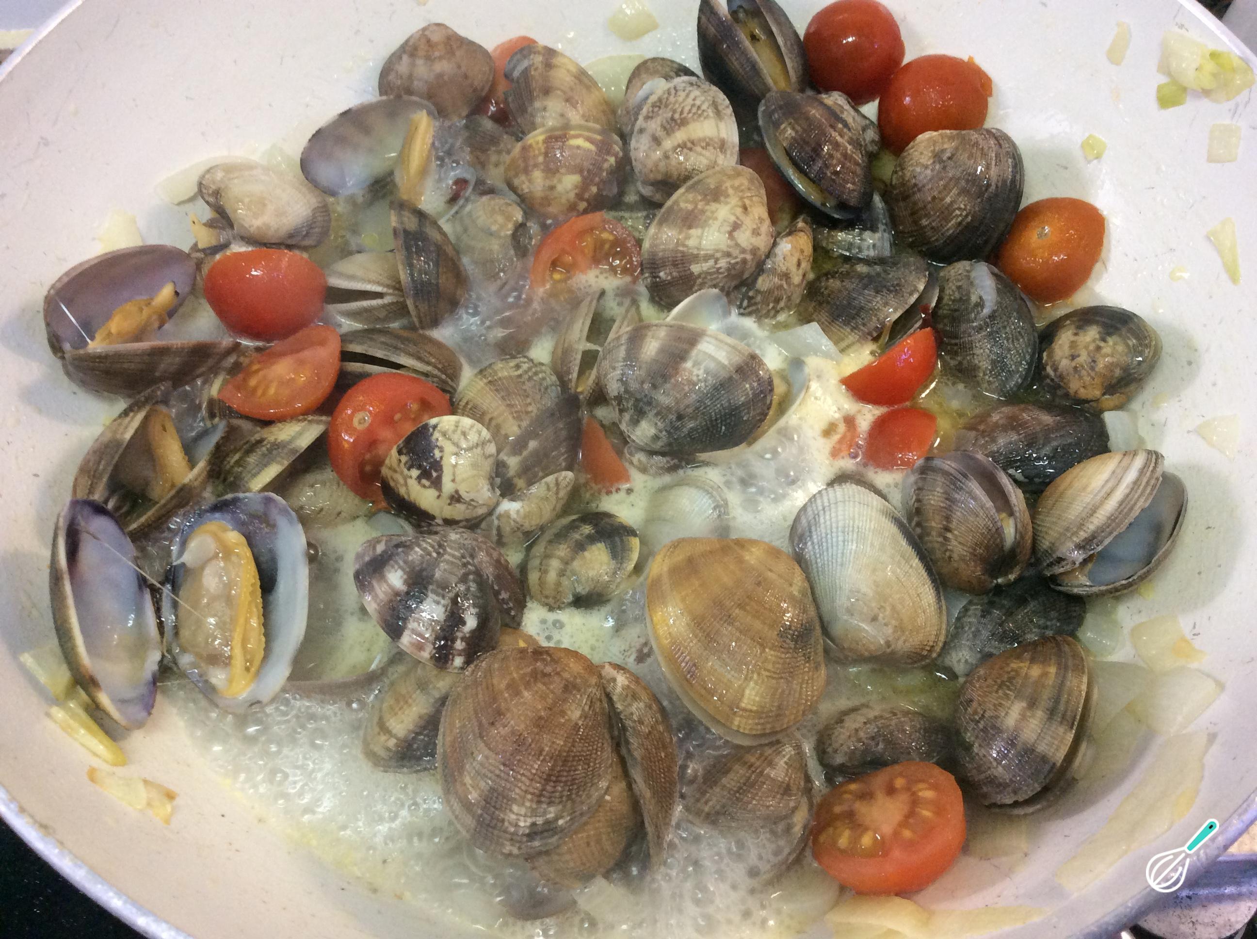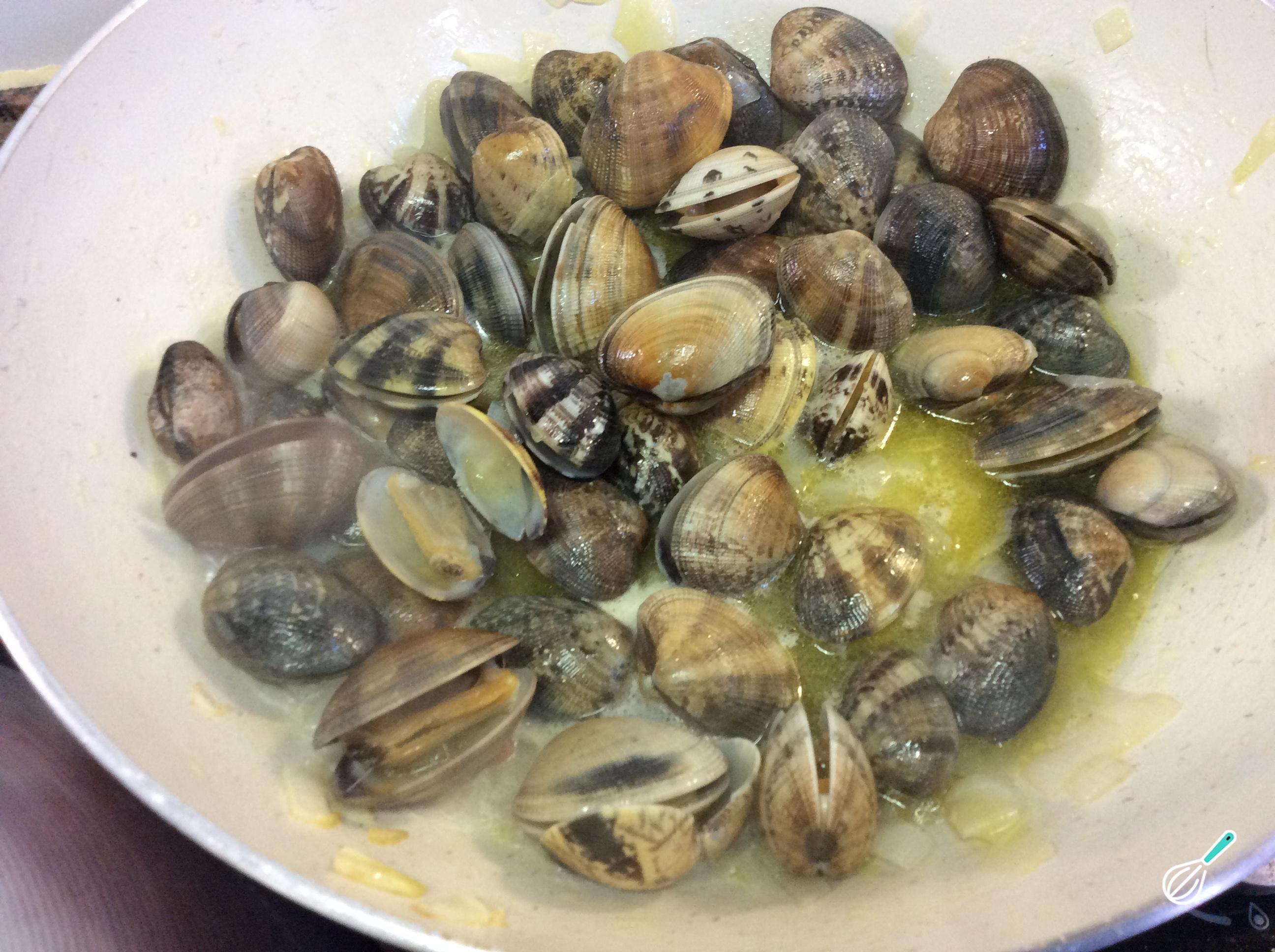 Depois de alguns minutos, quando a cebolinha estiver macia, junte os vôngoles.