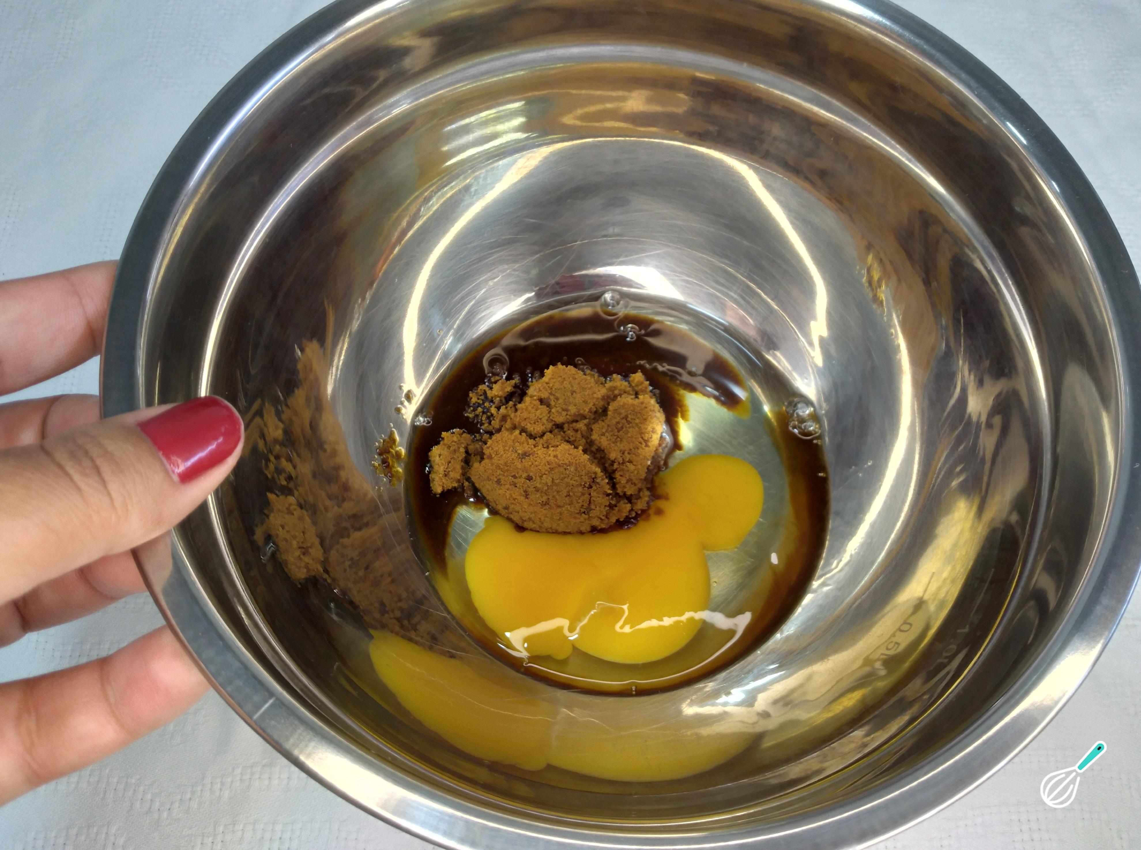 Em um bowl ou tigela, coloque o ovo, o açúcar mascavo e a essência de baunilha. Misture tudo muito bem com um fouet. O açúcar mascavo pode ter alguns gruminhos, então mexa muito bem para que fique bem lisinho.