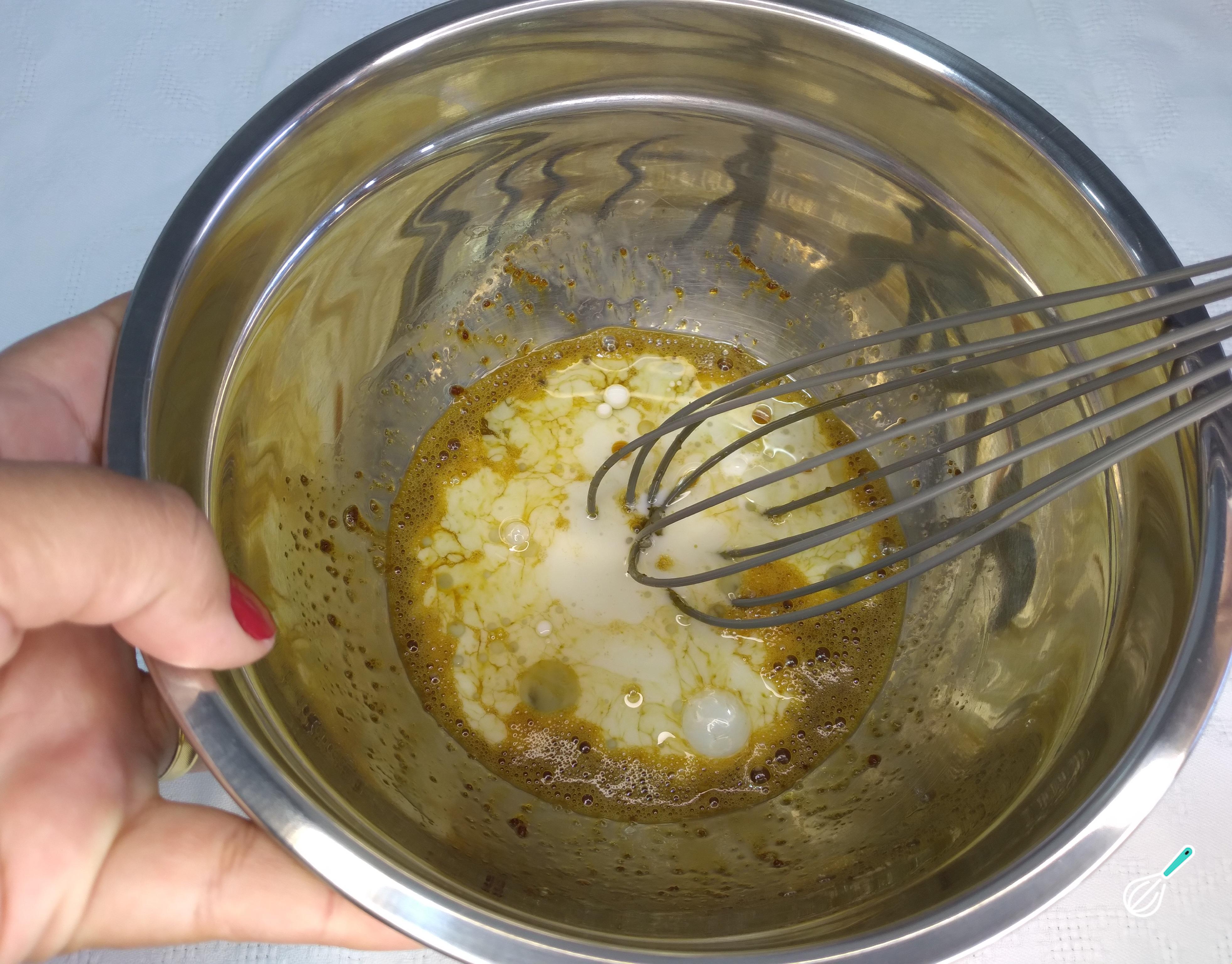 Feito isso, acrescente o óleo de canola e o leite vegetal. O óleo de canola tem um gosto neutro, assim a receita ficará mais agradável ao paladar. Novamente, com o auxílio de um fouet, misture tudo muito bem.