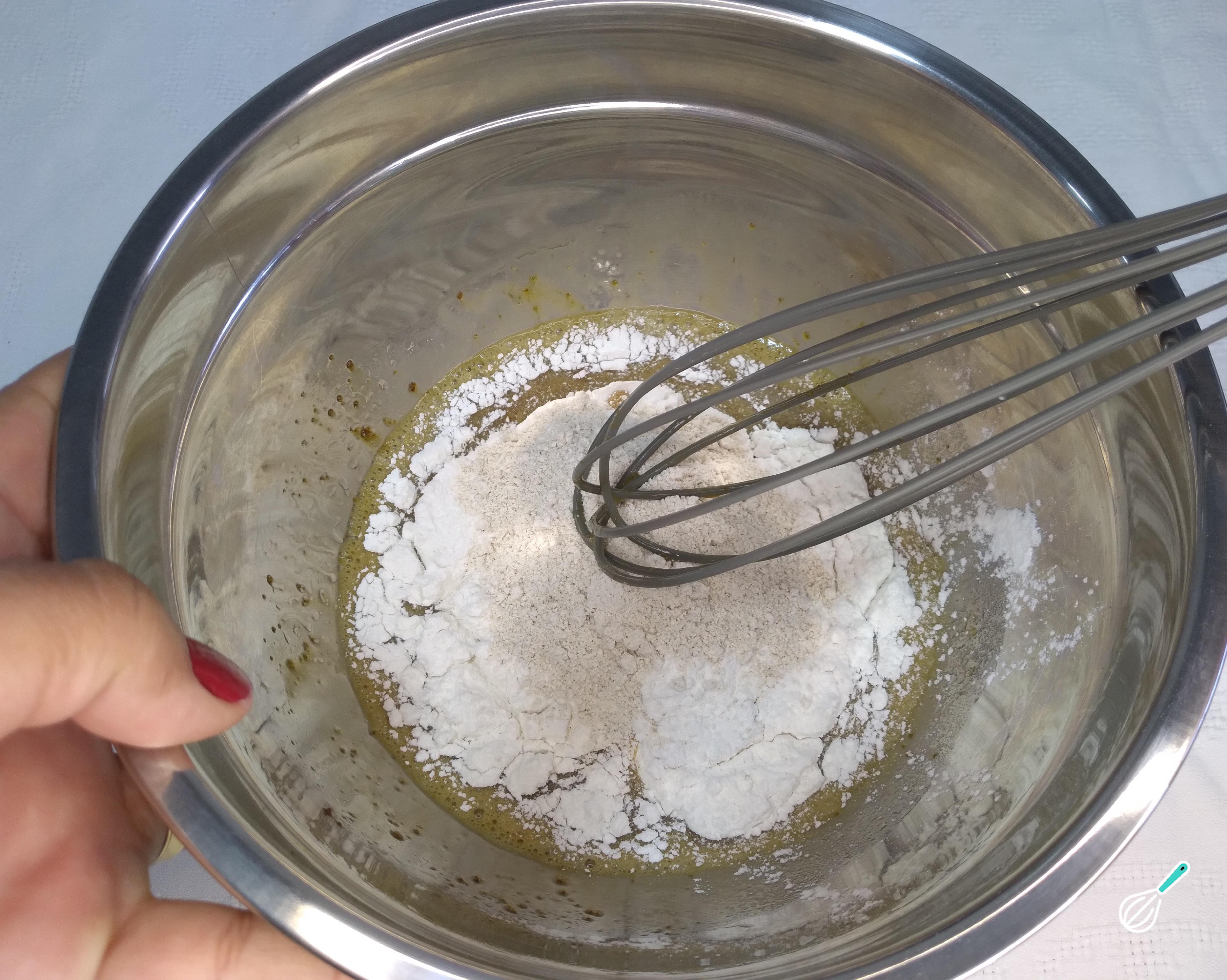Depois de misturar bem os líquidos, acrescente as farinhas. Coloque as farinhas juntas e misture muito bem. Mexa com o fouet, para que a massa fique bem homogênea.