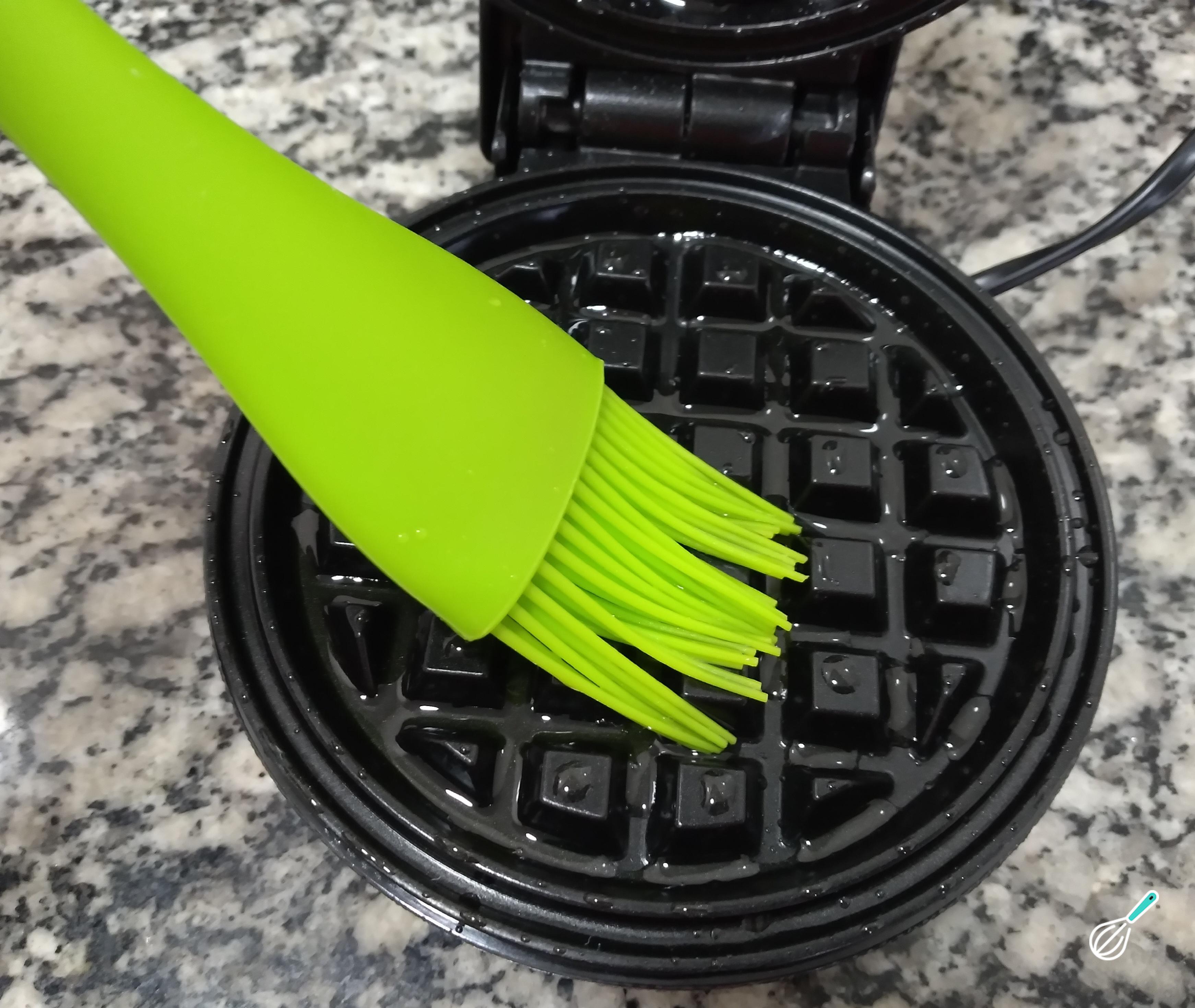 Com o auxílio de um pincel, coloque um fio de azeite na máquina de waffle e ligue para que pré aqueça. Adicione a massa, feche e deixe assar.