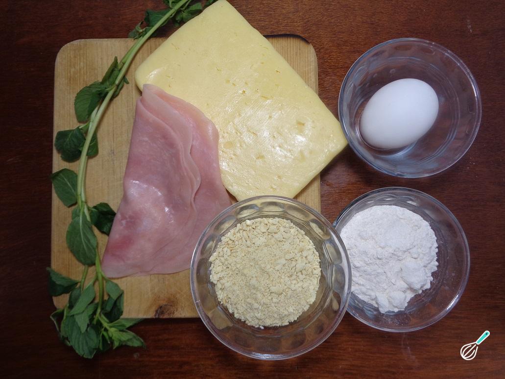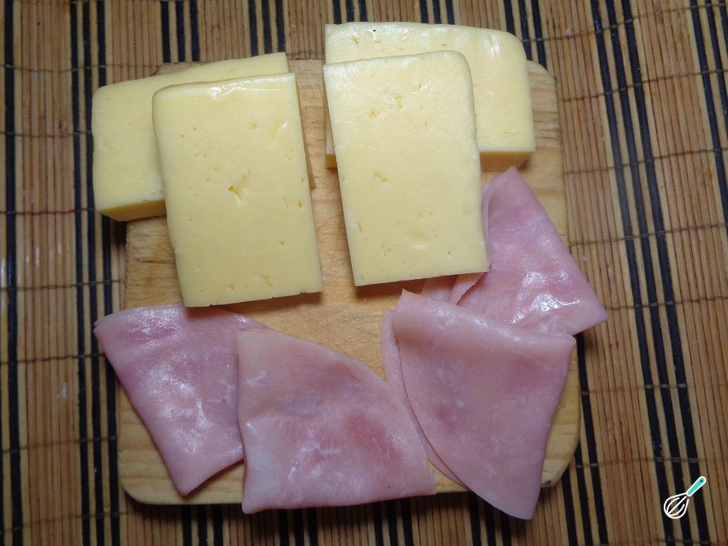Na imagem seguinte, você pode ver os ingredientes necessários para a preparação deste waffle de queijo e presunto.