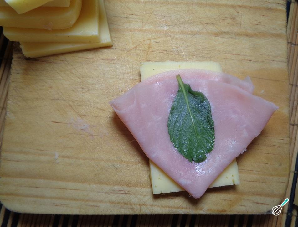 Pegue um dos retângulos de queijo e cubra com uma fatia de presunto. Coloque uma folha de hortelã sobre o presunto, pegue outro retângulo de queijo e coloque-o sobre a folha de hortelã. O resultado deve ser uma espécie de sanduíche com queijo na vez do pão.