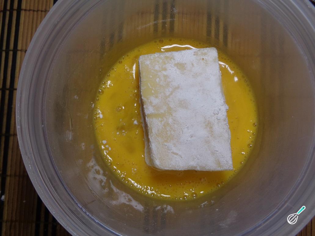 Em seguida, passe o sanduíche de queijo no recipiente do ovo batido, cobrindo bem.