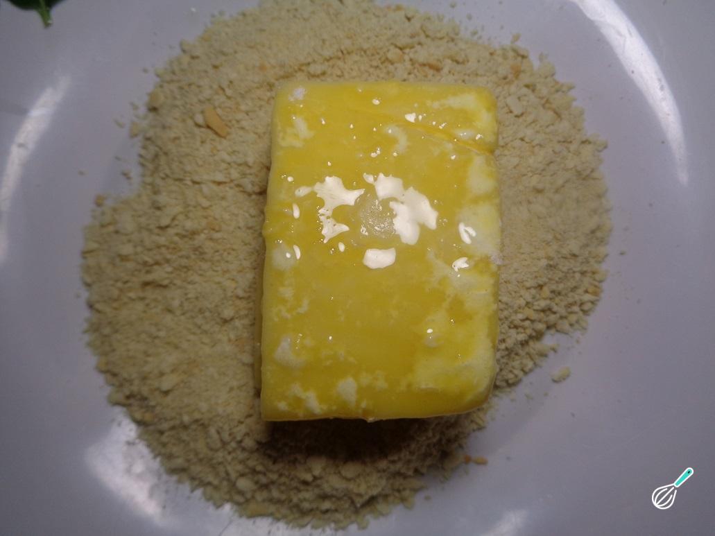 Finalmente, cubra completamente o sanduíche de queijo com a farinha de rosca, garantindo que toda a superfície tem este ingrediente.