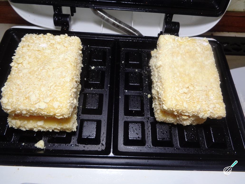 Para finalizar o waffle de queijo e presunto, coloque os sanduíches na máquina de waffles e feche gradualmente enquanto o queijo derrete. Continue vigiando os waffles durante o cozimento para que não cozinhem demasiado e fiquem líquidos com o queijo derretido!