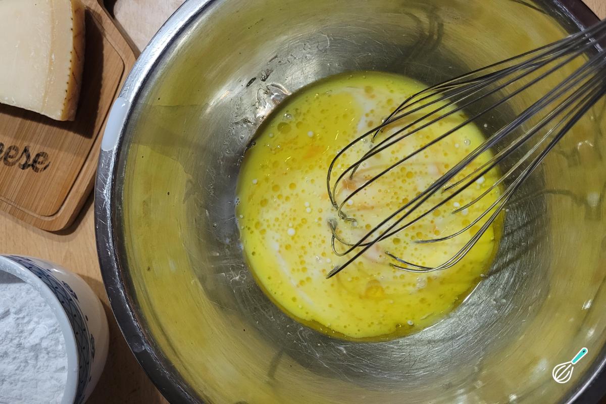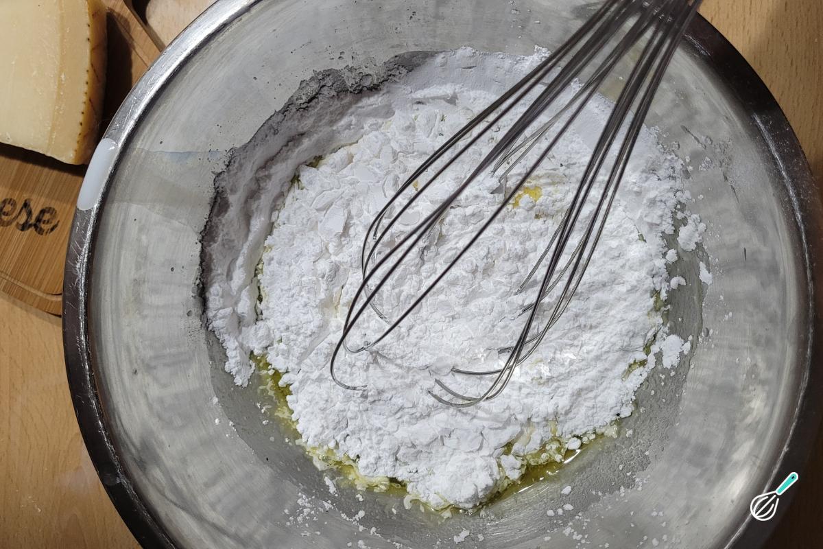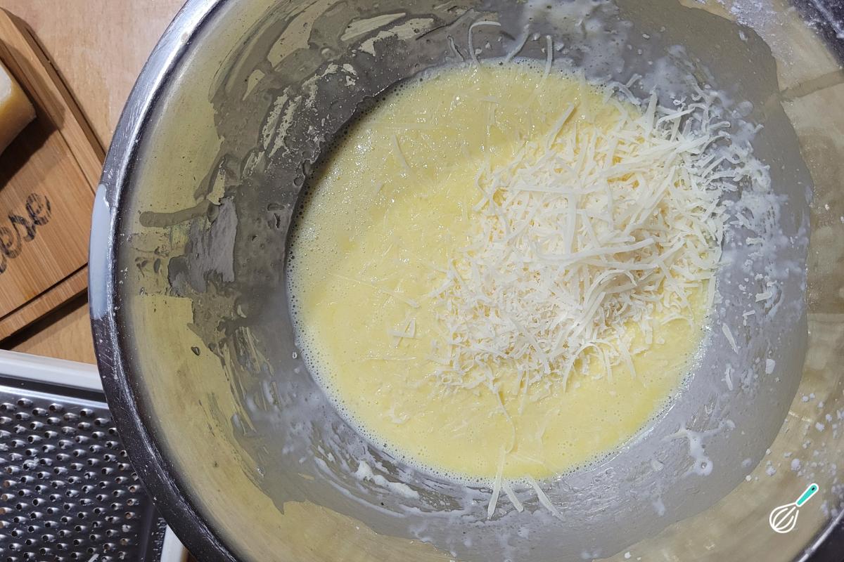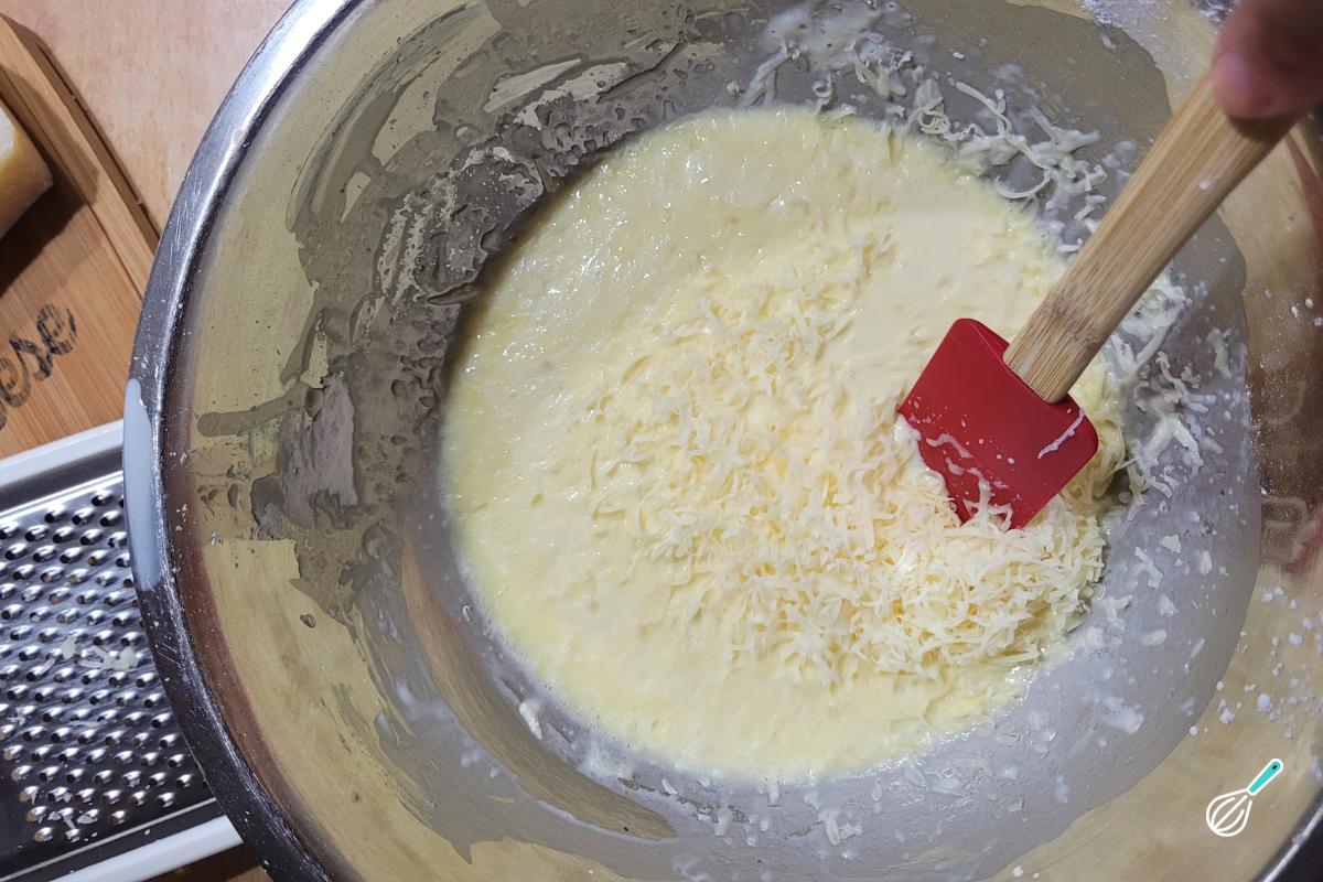 Aqui também usei queijo parmesão, mas pode substituir por outro queijo (sugiro um queijo mais curado e com sabor mais intenso, como um meia cura). Como o parmesão é salgado, não adicionei sal, mas pode também ajustar o sal de acordo com seu gosto.