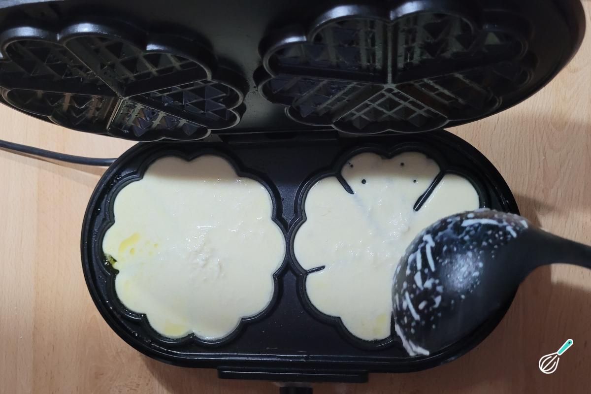 Com uma concha, transfira a massa com cuidado para a máquina de waffle já quente e untada com um pouco de óleo.