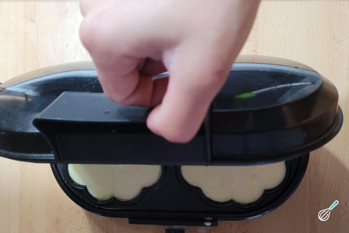 Feche e deixe por cerca de 10 minutos. Evite abrir antes do tempo porque se a massa estiver crua e não firme, pode acabar grudando de um dos lados.