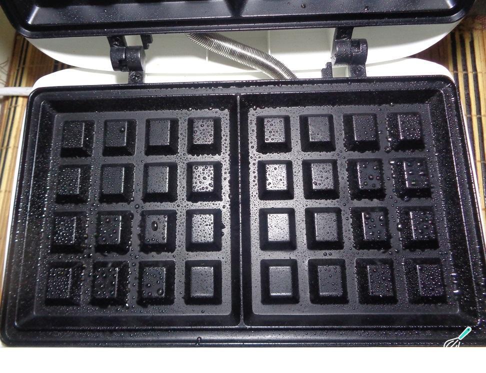 Ligue a máquina de waffles e deixe aquecer perfeitamente. Uma vez quente, pulverize um pouco de óleo em spray em cada uma das laterais.