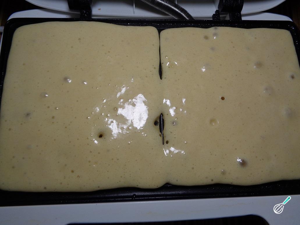 Coloque um pouco da massa de waffles em cada um dos compartimentos da máquina de waffle, tentando não derramar. Em seguida, feche a máquina e abra apenas quando o aparelho indicar que está pronto.
