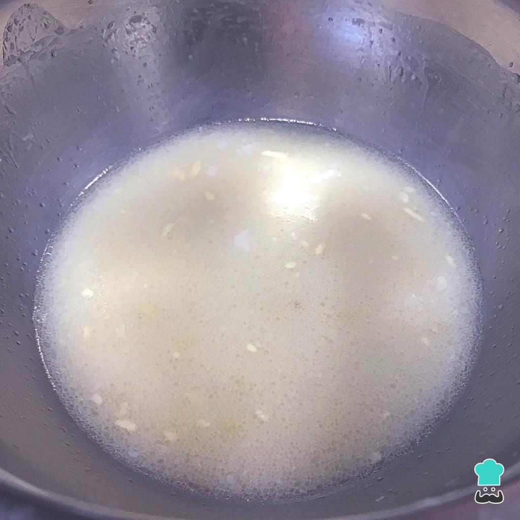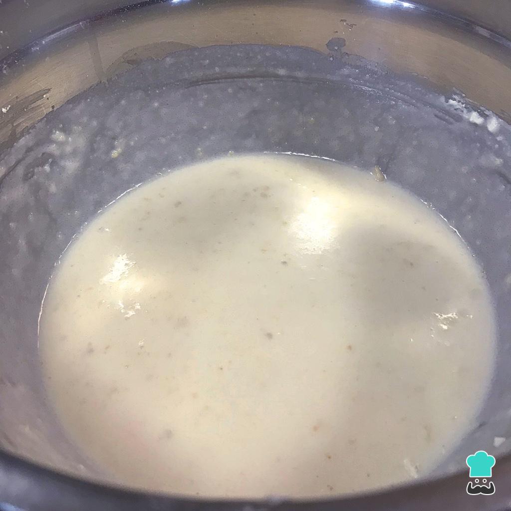 À parte junte o leite vegetal com o xylitol, o óleo de coco e a baunilha. Adicione a mistura de banana com água e misture.