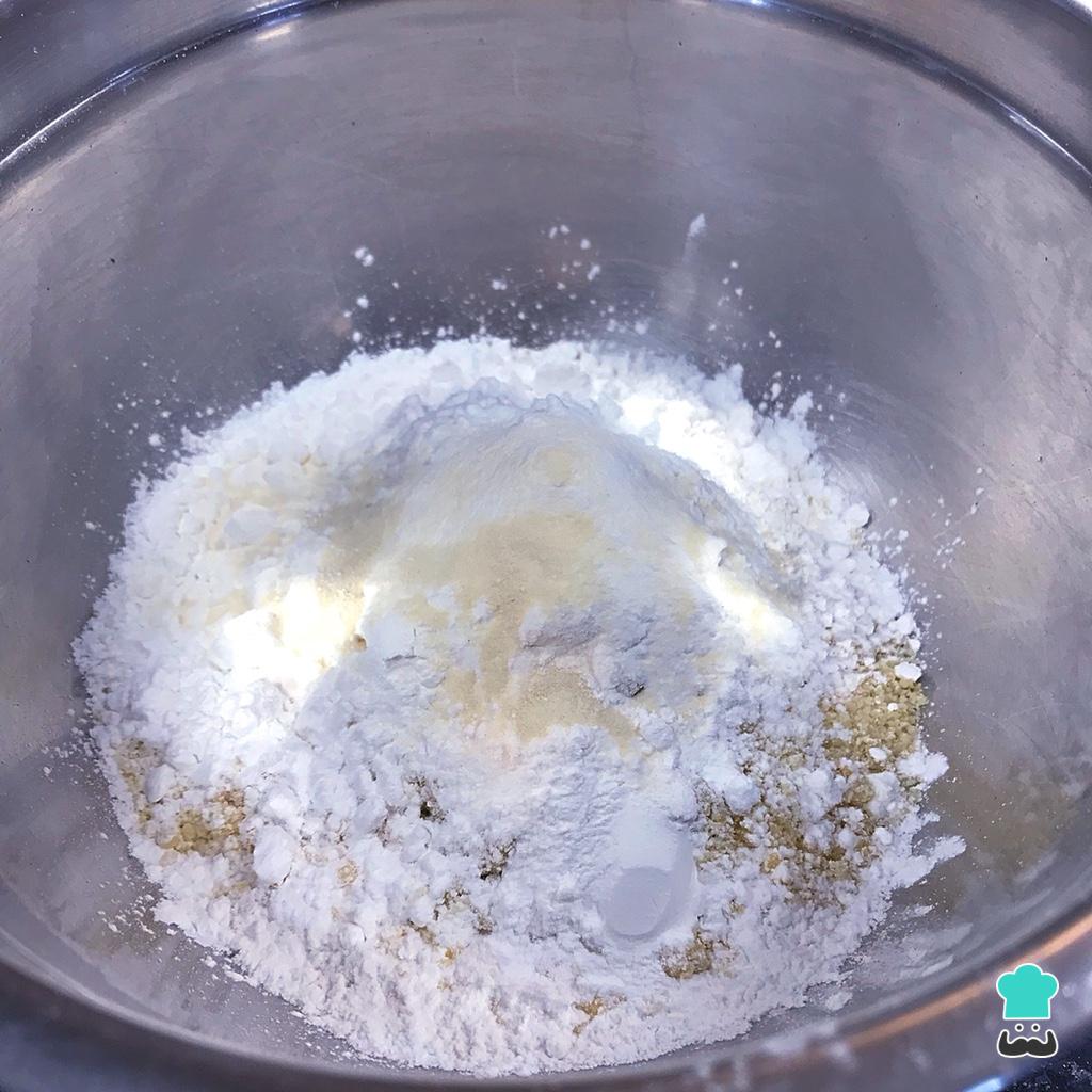 Numa outra vasilha misture os secos: a farinha de arroz, a farinha de amêndoas, o polvilho doce, o fermento químico, o bicarbonato de sódio, o sal e a goma xantana.