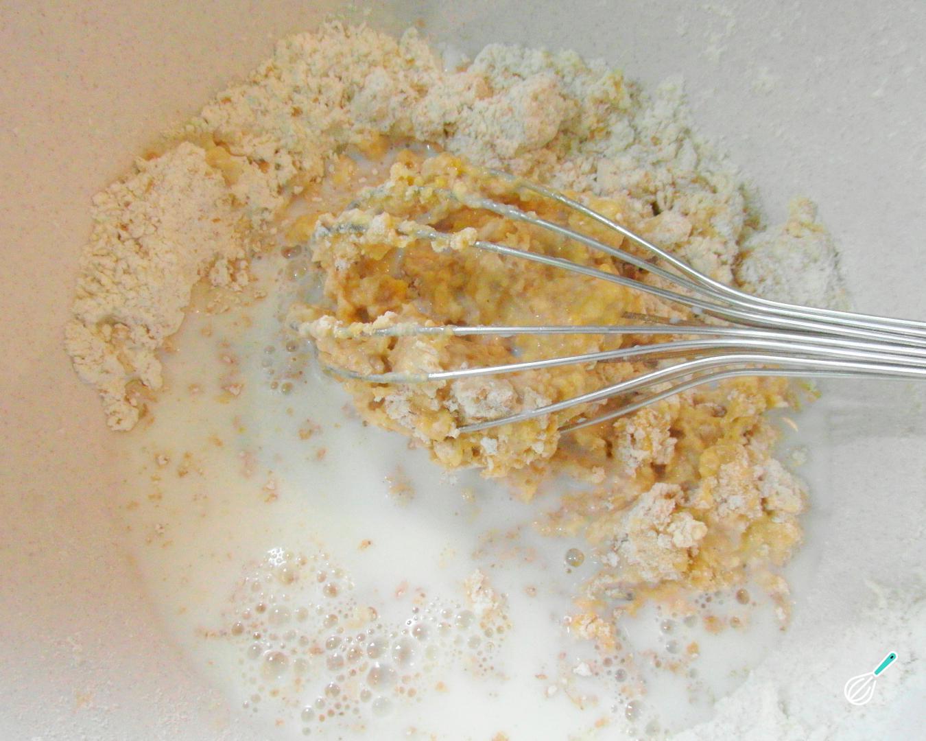 Em um bowl misture os ingredientes secos: a farinha, o açúcar, a canela, o fermento e o sal. Adicione a bebida de soja e o óleo e misture muito bem, de preferência com um fouet para não se formarem grumos.