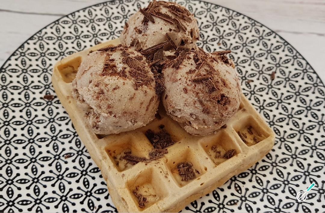 Sirva seus waffles veganos com acompanhamento a gosto - nós sugerimos este saboroso sorvete vegano de chocolate sem açúcar. Experimente e conte nos comentários o que você achou!