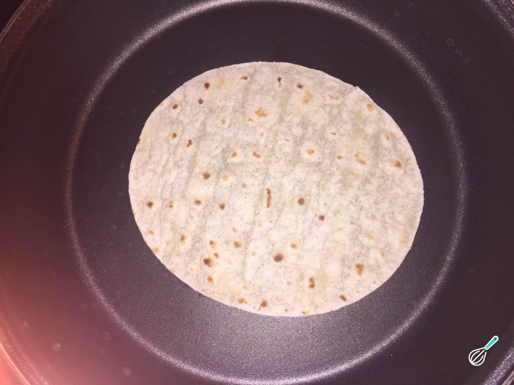 Comece por aquecer os wraps em uma frigideira. Enquanto aquece os wraps, bata os ovos com pimenta do reino e sal.