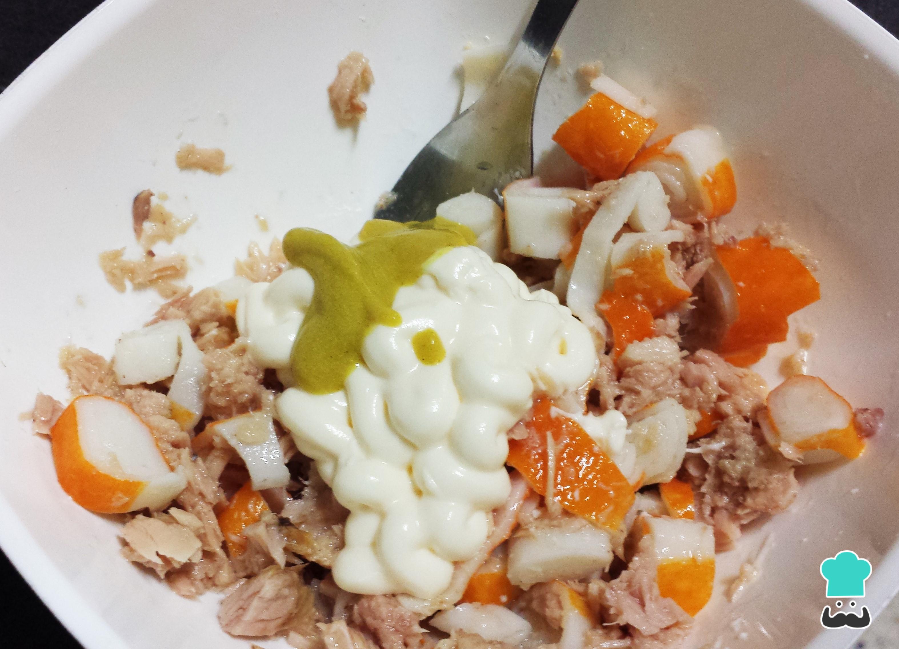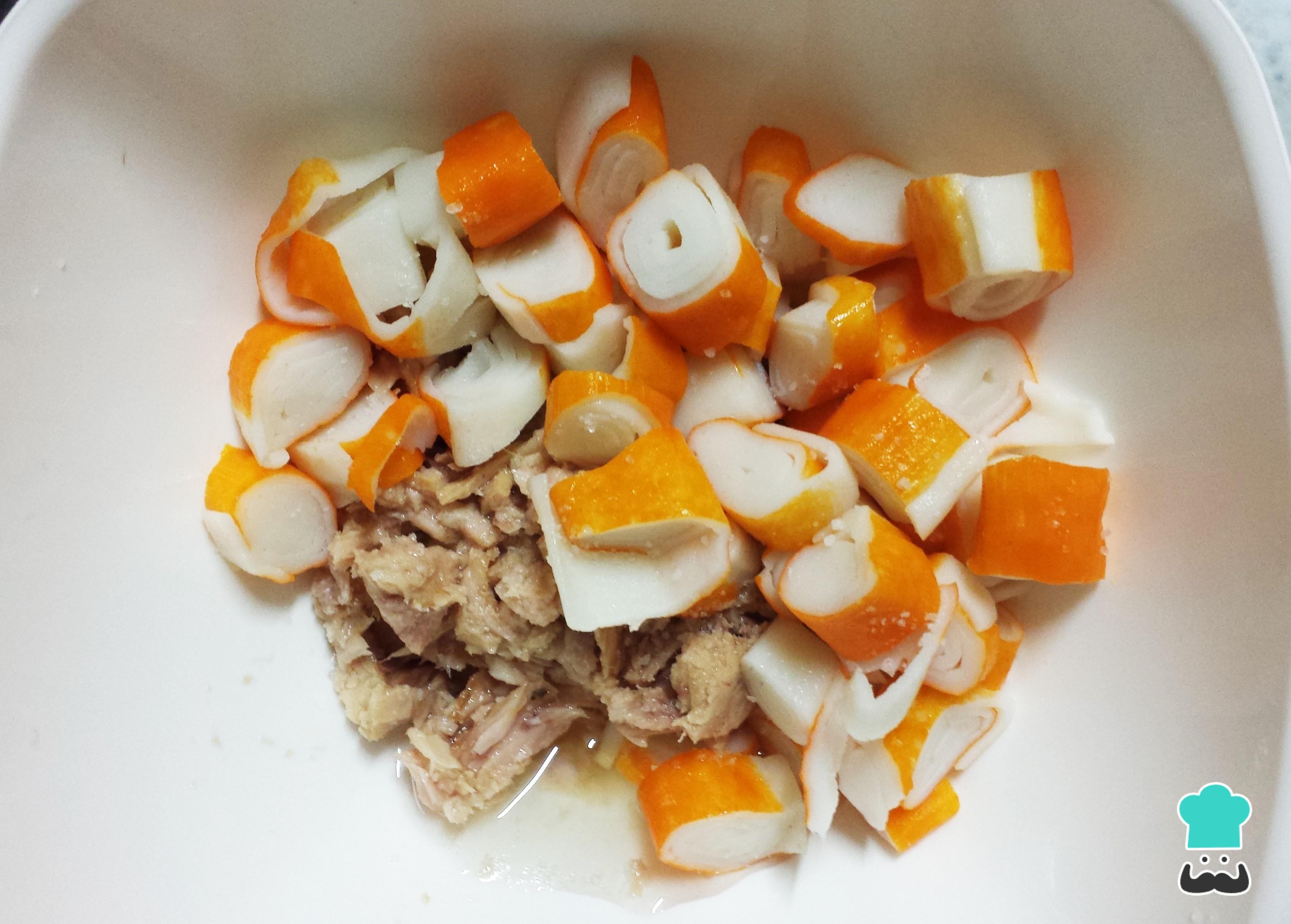 Para começar a preparar esta receita de wrap de atum, o primeiro passo é cortar o kani em pedaços e misturar com o atum.
