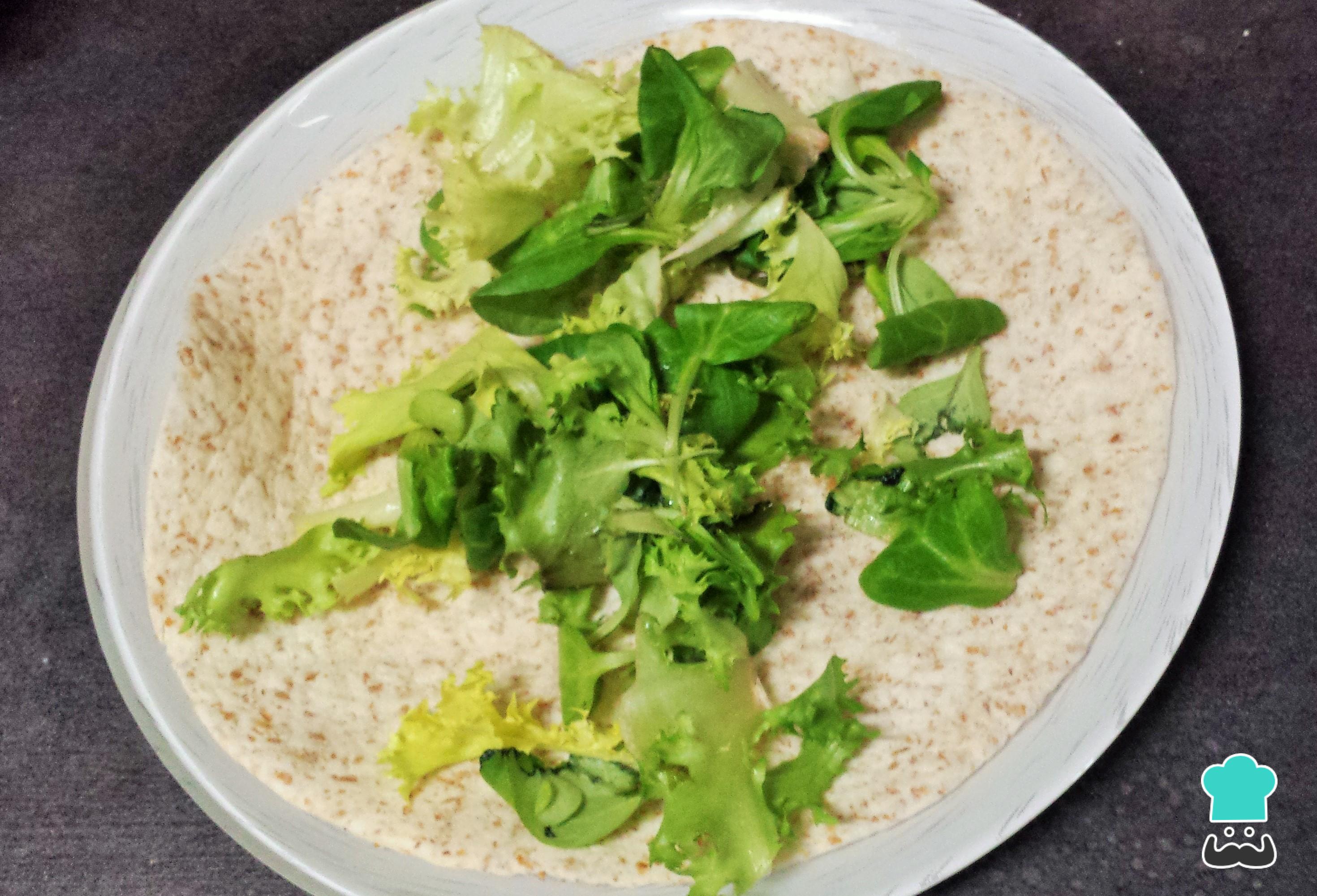 Coloque a tortilha em um prato e adicione uma porção da alface lavada e separada em pedaços.