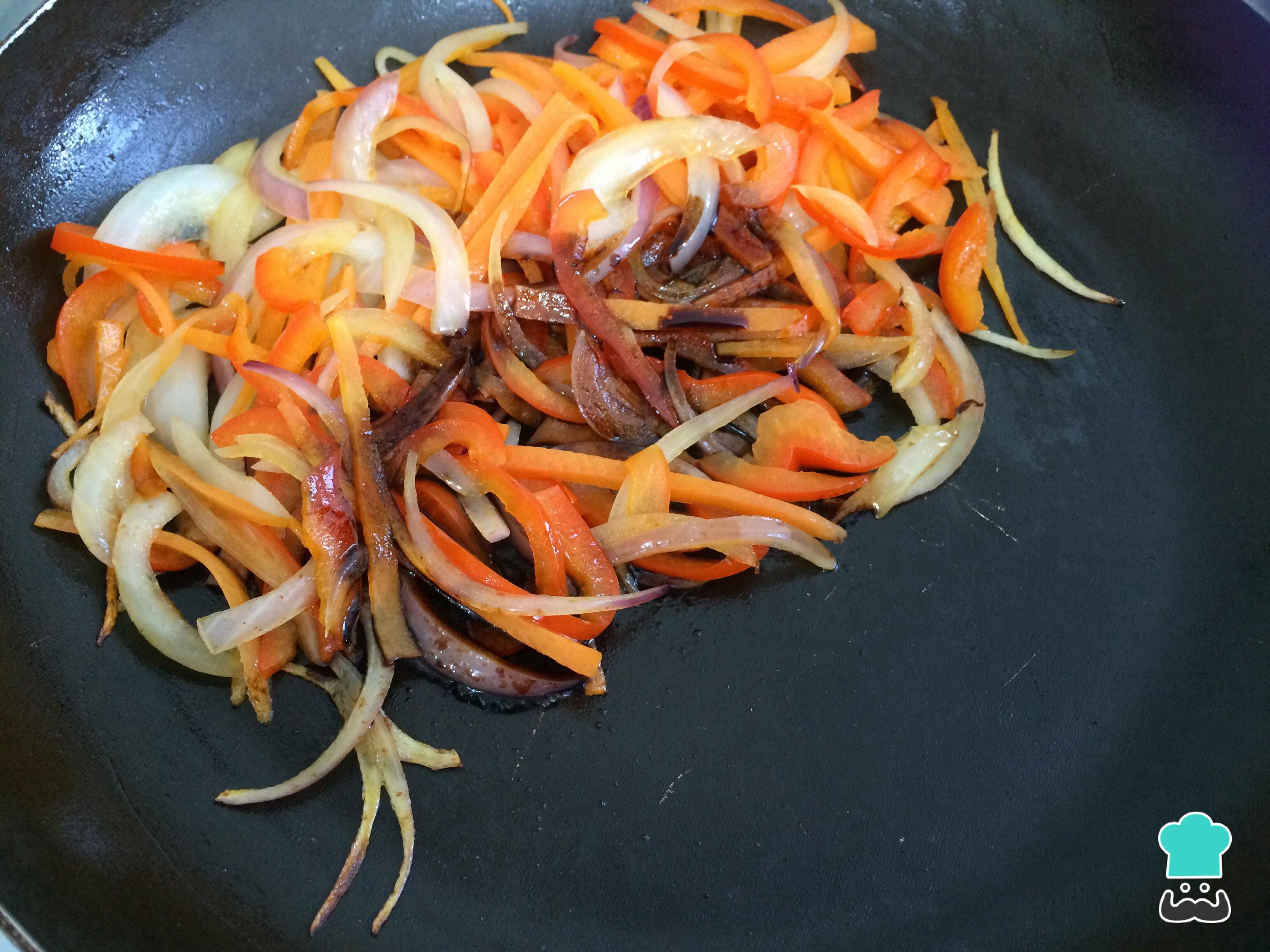 Antes de fazer esta receita, comece por reunir todos os ingredientes necessários. Para facilitar o processo, neste momento corte em juliana o pimentão, a cebola e o pepino.