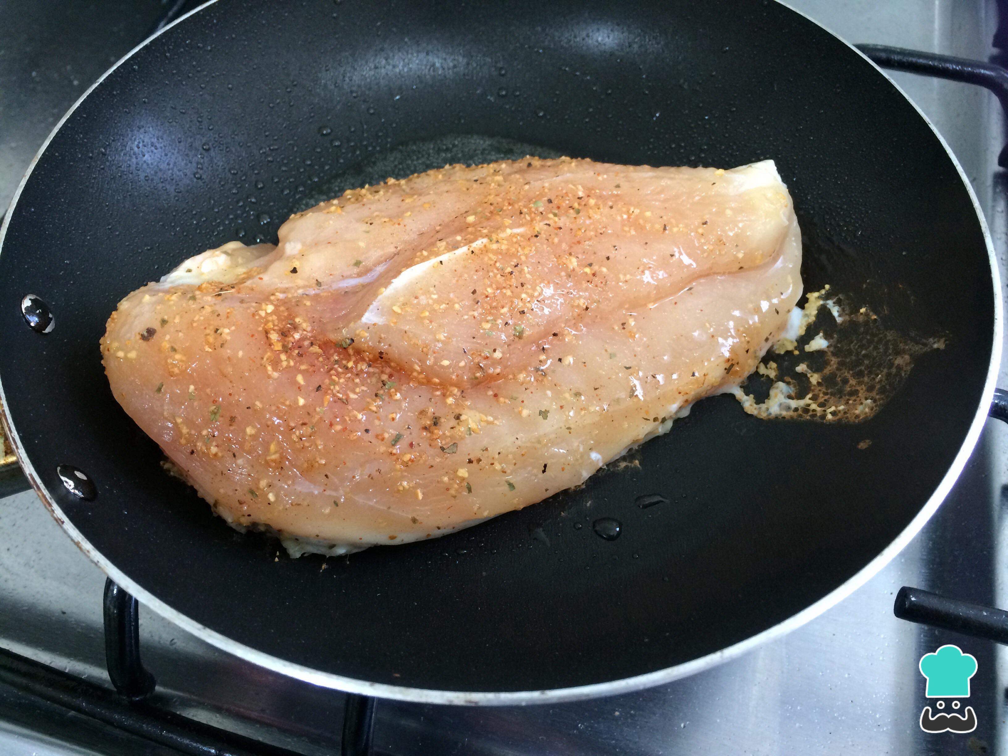 Noutra frigideira ou panela com um pouco de azeite, cozinhe o peito de frango inteiro e temperado com o tempero de frango, sal e pimenta a gosto. Dependendo do tamanho da peça, bastarão 10 minutos em fogo médio, virando de vez em quando.