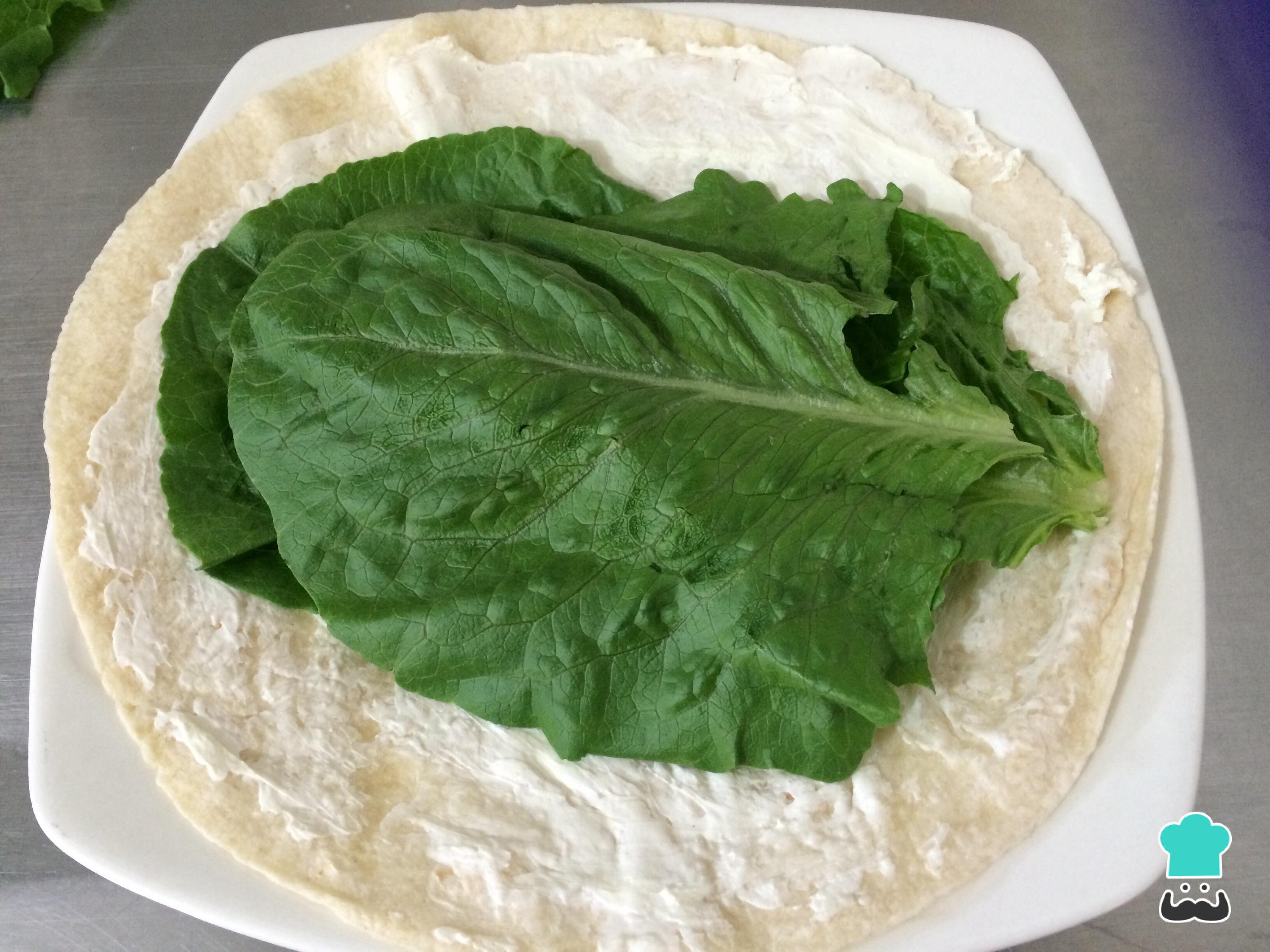 Após os passos anteriores, comece montando o wrap: esquente as tortilhas, espalhe nelas o queijo cremoso, e disponha as folhas de alface lavadas.