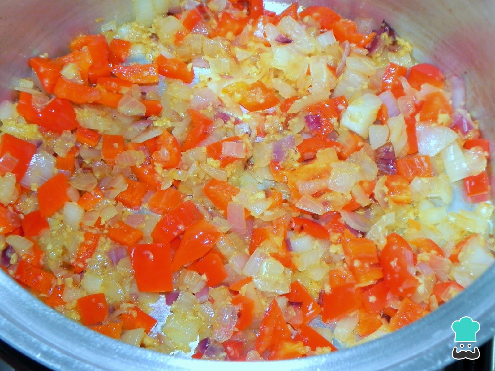 Separadamente, triture também a cebola, o pimentão, o alho, e o tomate. Coloque os ingredientes em uma panela e leve a refogar no azeite.