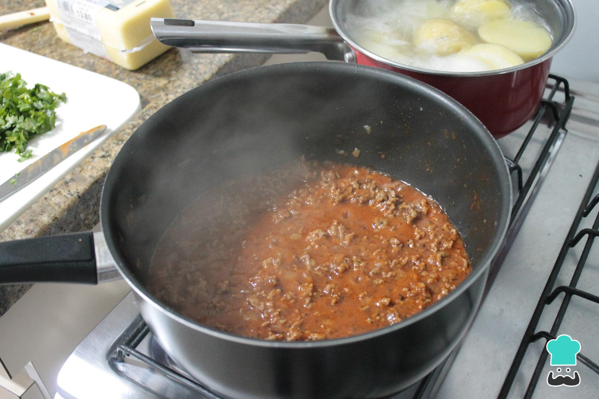 Adicione o bofe ao refogado e acrescente meio litro de água. Deixe cozinhar por 30 minutos antes de adicionar o leite de coco, o camarão seco e o dendê. Deixe cozinhar por 10 minutos e junte o camarão fresco e a pimenta.