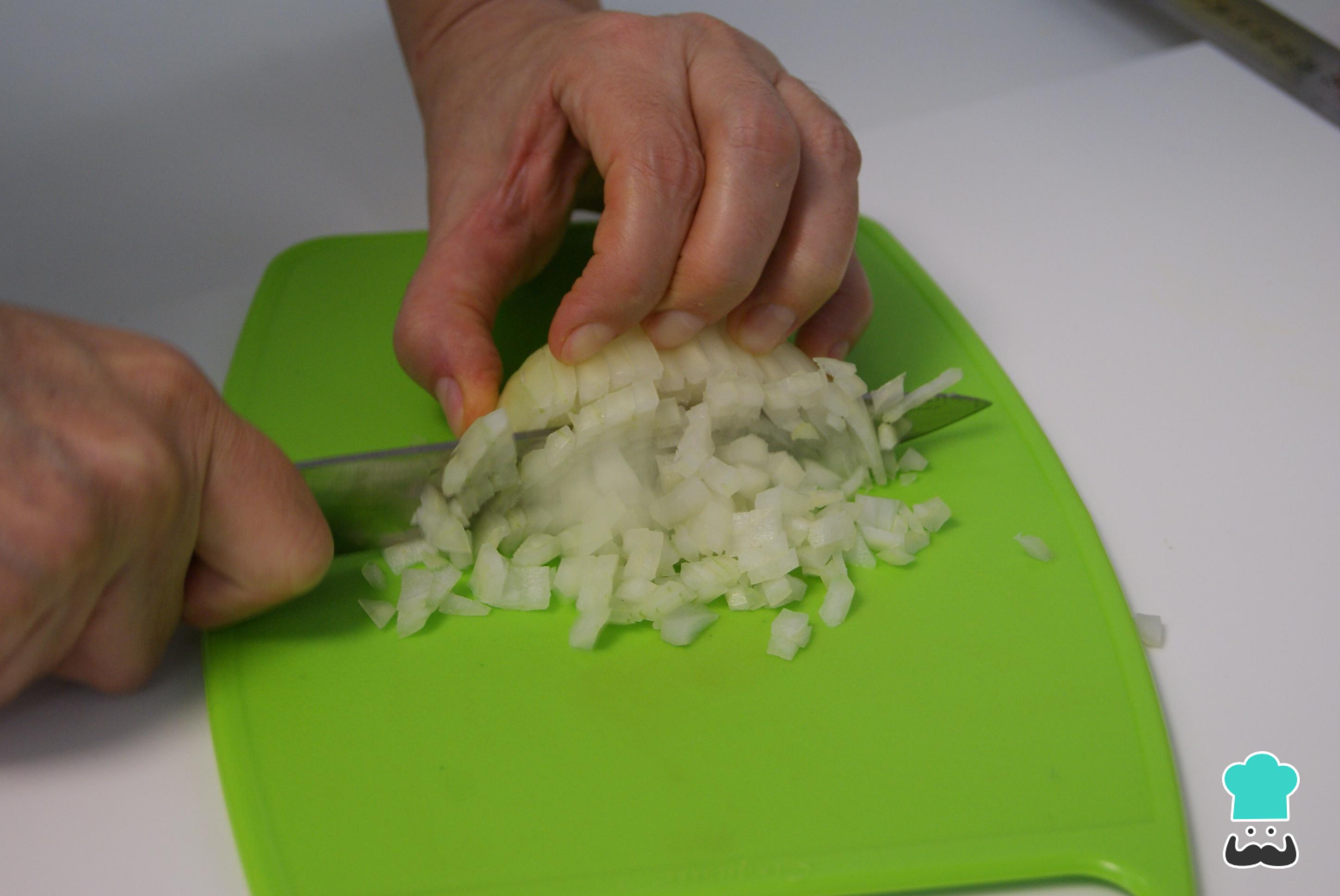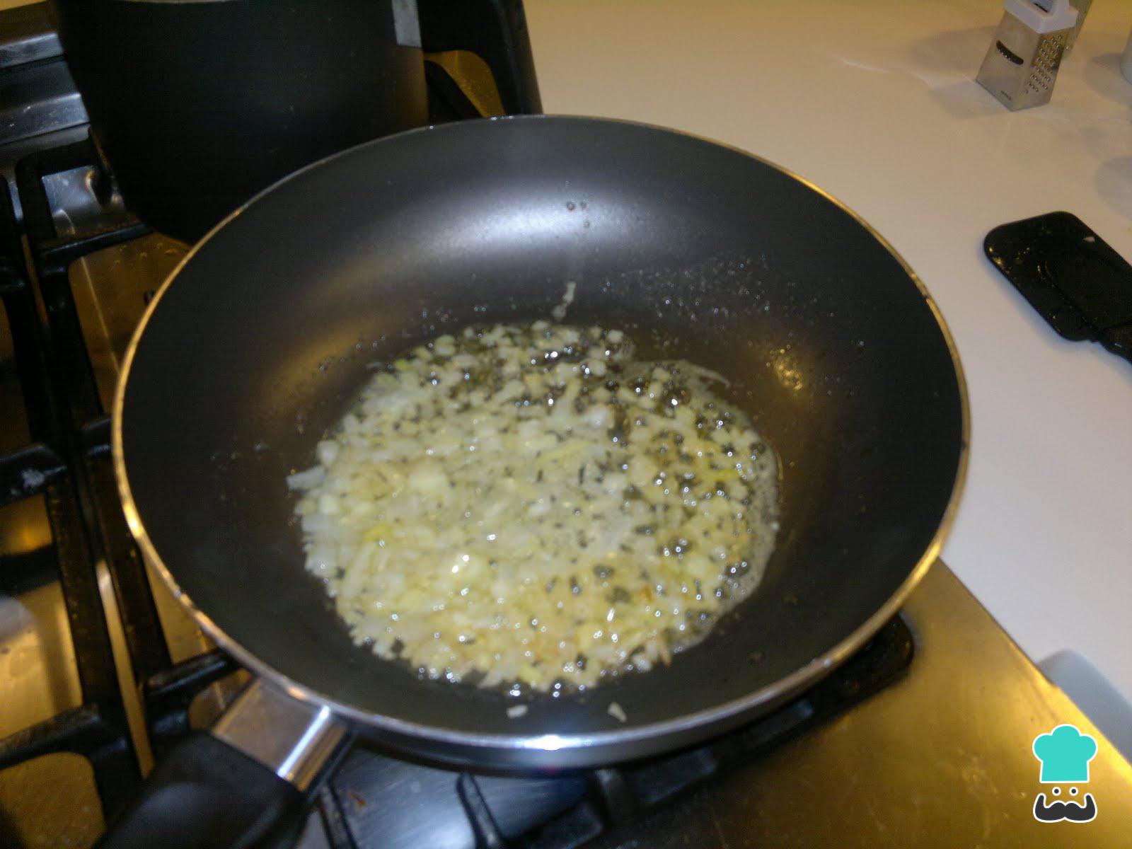 Coloque a cebola e o óleo numa frigideira antiaderente (de preferência do tipo wok) e leve ao fogo médio.