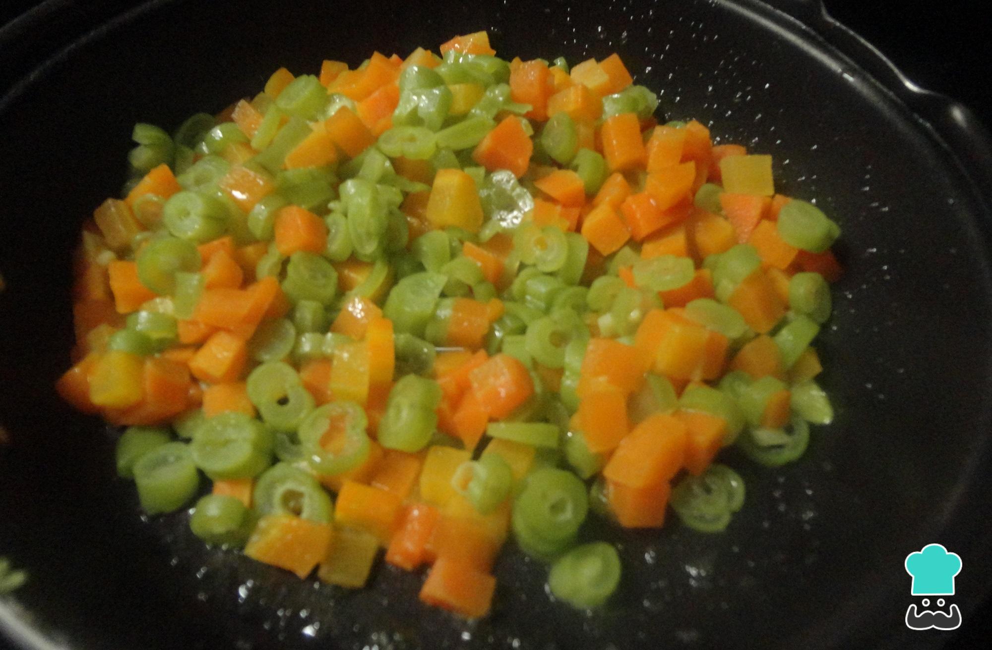 O passo seguinte do yakimeshi com frango é acrescentar a cenoura, saltear por 1-2 minutos, adicionar a vagem e repetir. Tempere estes legumes com sal e pimenta.