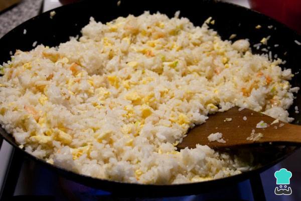 Bata os ovos, tempere com sal e pimenta e adicione à frigideira. Não pare de mexer enquanto os ovos cozinham, depois acrescente o arroz e o frango e envolva tudo.