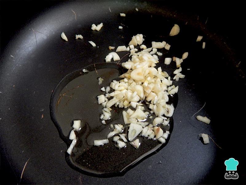 Para preparar esta receita de yakimeshi, comece por levar ao fogo médio uma panela com o óleo de soja, a cebola e os alhos finamente picados.