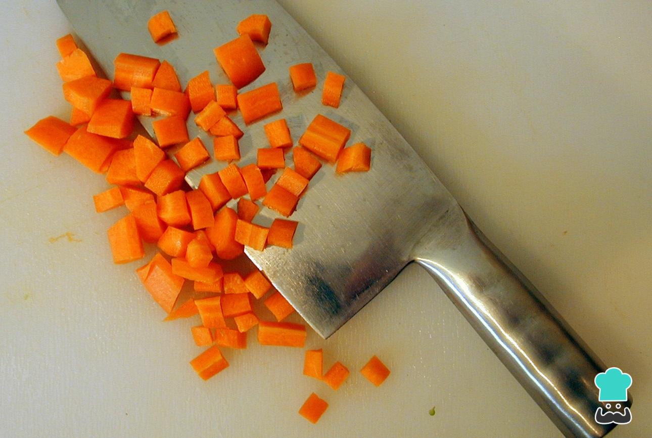 Enquanto o arroz cozinha, prepare os restantes ingredientes do yakimeshi: descasque a cenoura, corte em cubos pequenos e, numa frigideira funda (de preferência wok) com o óleo de gergelim, salteie a cenoura até ficar dourada. Retire para um prato.