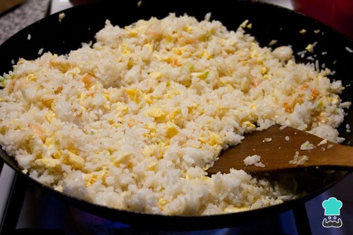 Quando o arroz estiver cozinhado, bata os ovos e coloque fritando na frigideira dos legumes. Antes que comecem a cozinhar, acrescente o arroz e mexa continuamente, assim você conseguirá ovos mexidos bem integrados no arroz. Tempere com sal e pimenta.