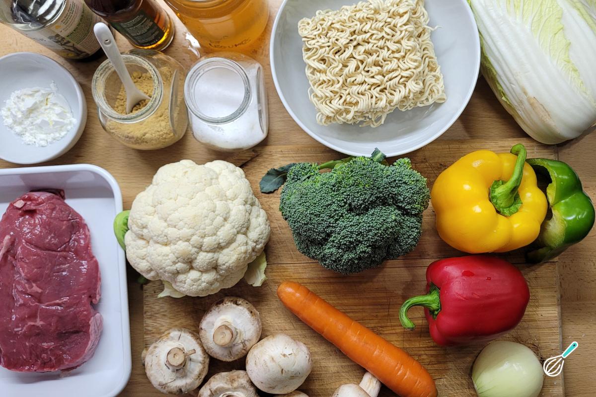 Separe os ingredientes para fazer seu Yakisoba de carne. Essa receita é super versátil e você pode substituir ou adicionar mais vegetais conforme a sua preferência e o que você tem na geladeira. As carnes mais usadas são alcatra, patinho ou filé mignon.