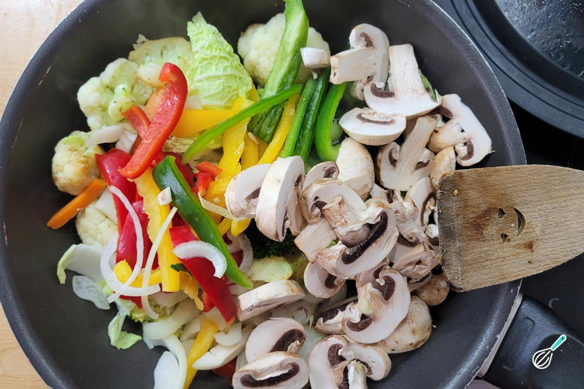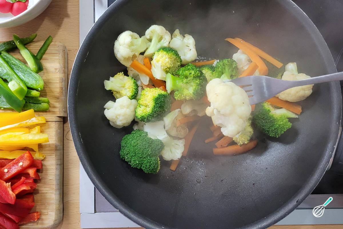 Deixe que dourem um pouco, abaixe o fogo, coloque um pouquinho de água e tampe a frigideira. Isso cria um vapor que faz com que os vegetais cozinhem mais rápido sem perder a textura. Assim também fica mais fácil controlar o ponto da sua preferência.