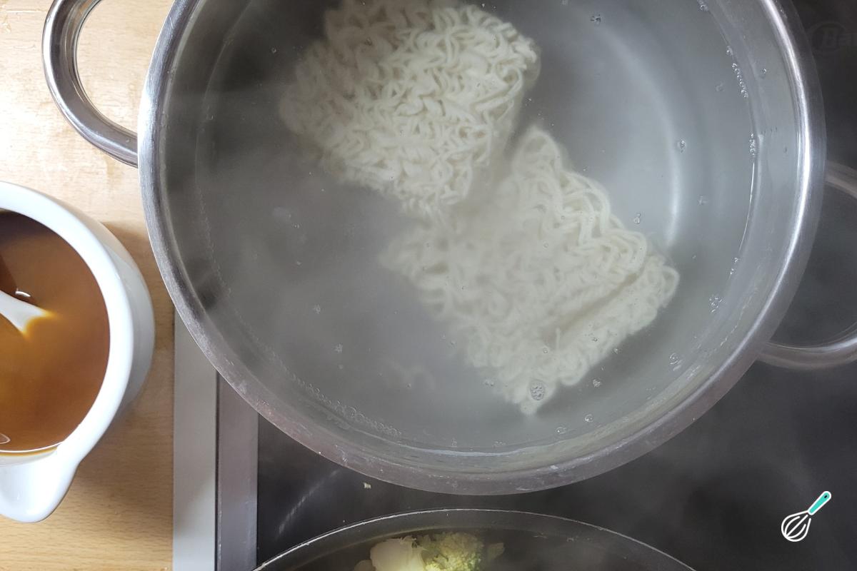 Quando a água do macarrão estiver fervendo, tempere com sal, adicione o macarrão e cozinhe pelo tempo indicado na embalagem. Normalmente o macarrão para Yakisoba cozinha bem rápido (cerca de 3 minutos).