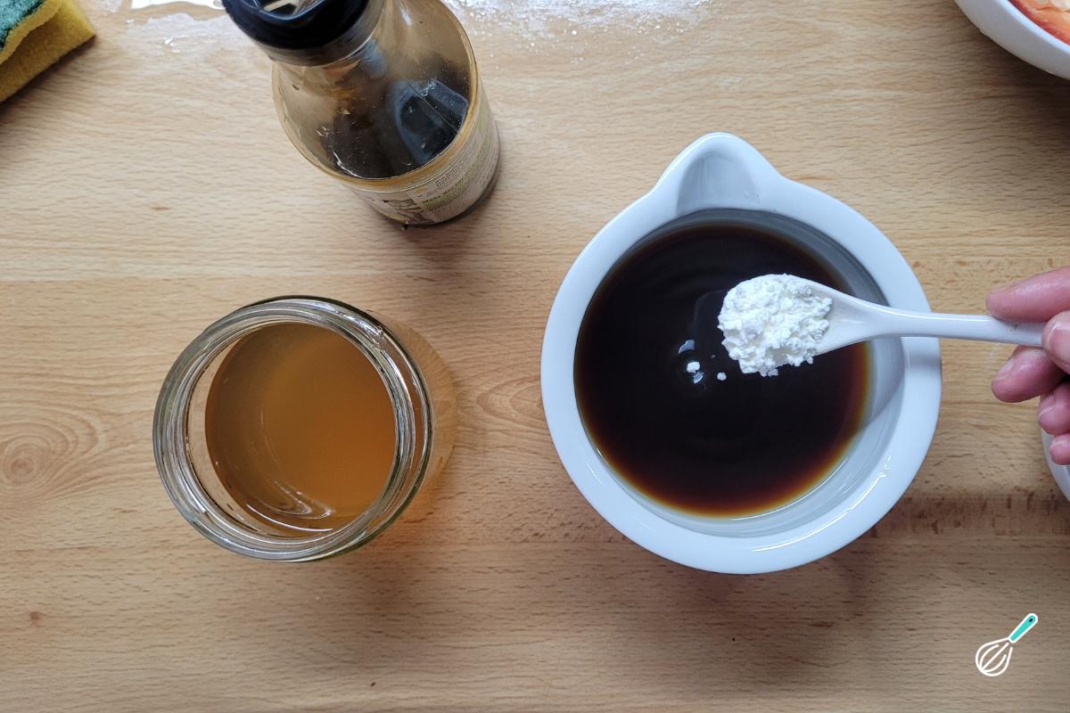 Enquanto isso, prepare o molho misturando o shoyu com o amido de milho.