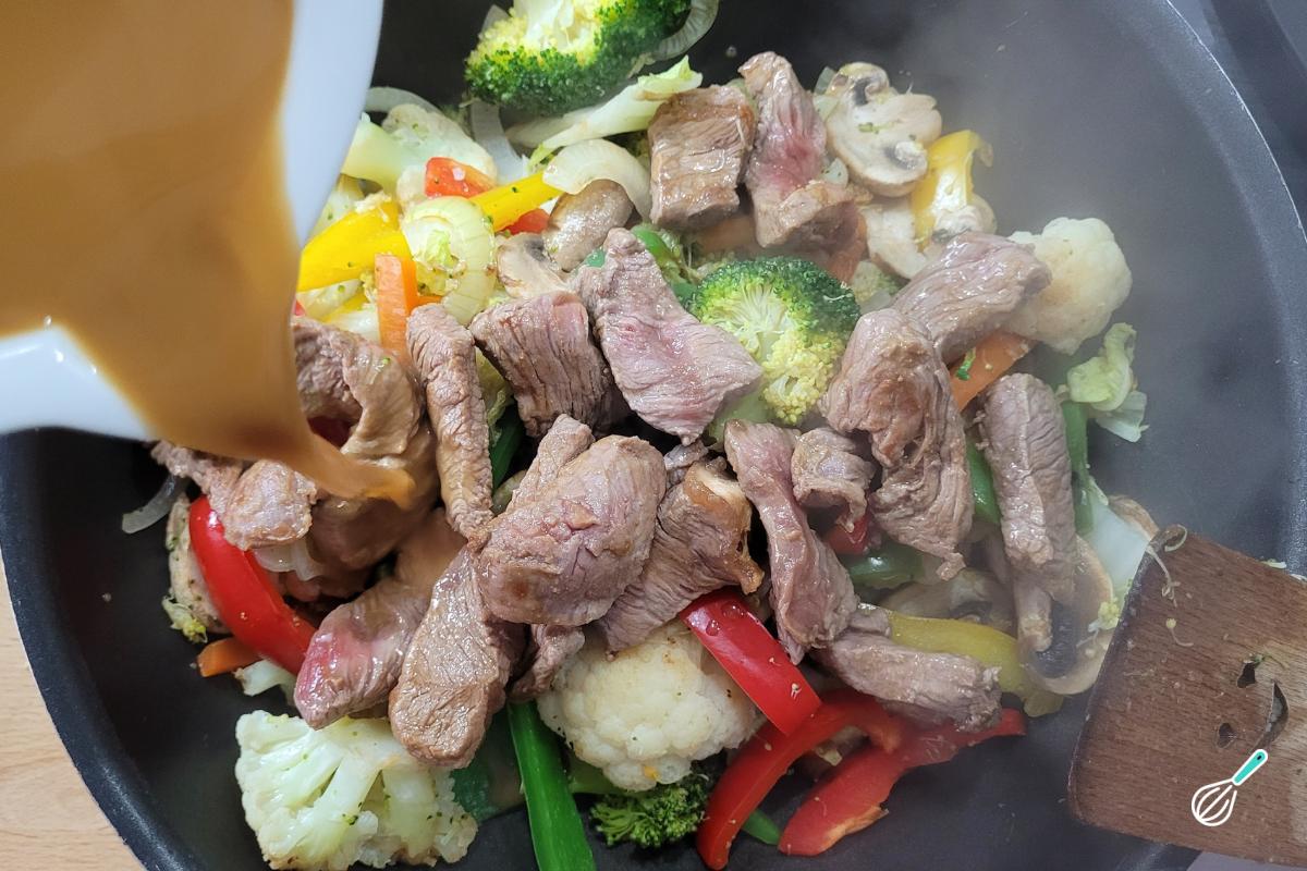 Volte com a carne para a frigideira e regue com o molho, em seguida adicione o macarrão já cozido e misture para envolver bem com os vegetais e o molho.