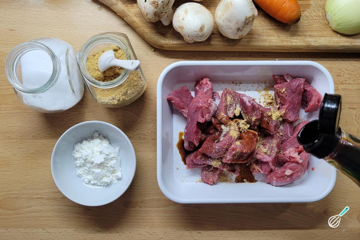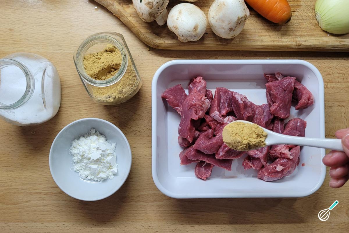Corte a carne em tiras finas e tempere com o gengibre em pó.