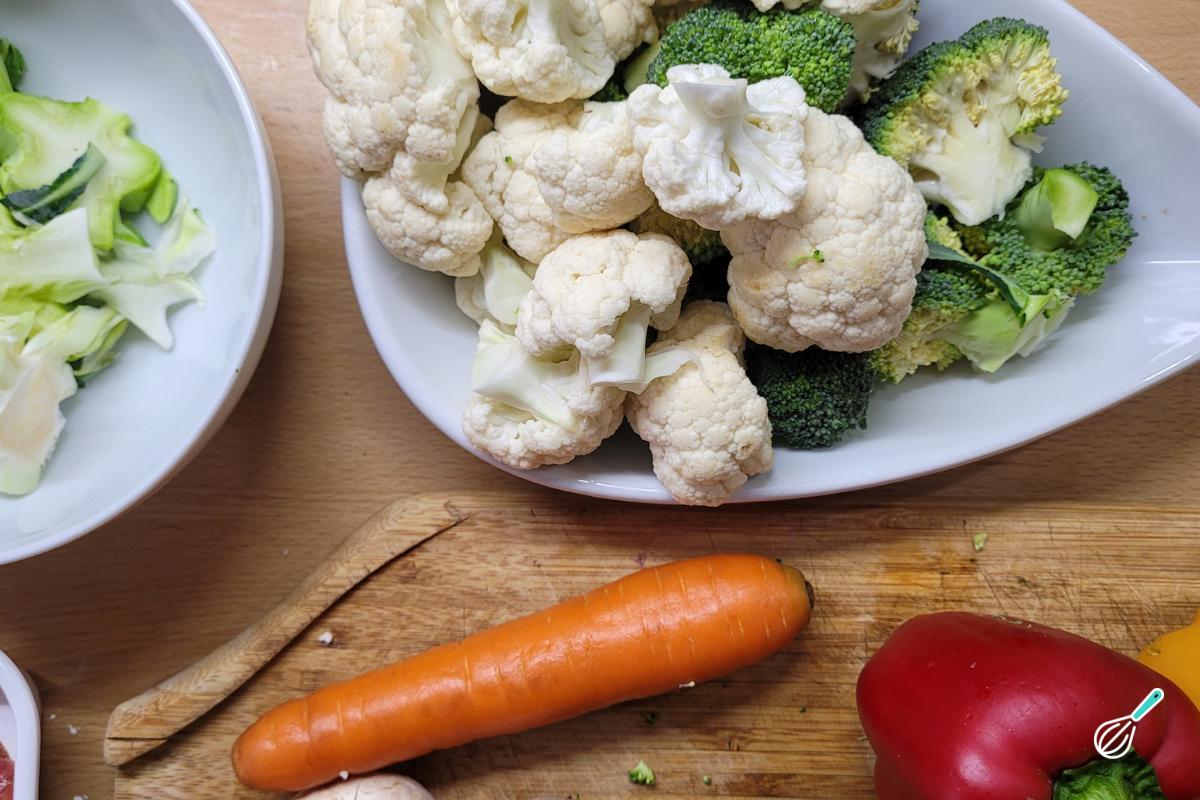 Enquanto a carne absorve o tempero, corte os vegetais. Corte a couve-flor e o brócolis em floretes.