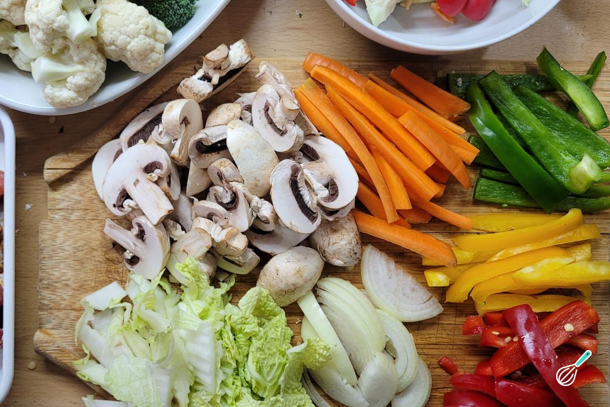 Corte a acelga, a cenoura e os pimentões em tiras. Corte a cebola em meias-luas e os cogumelos em fatias.