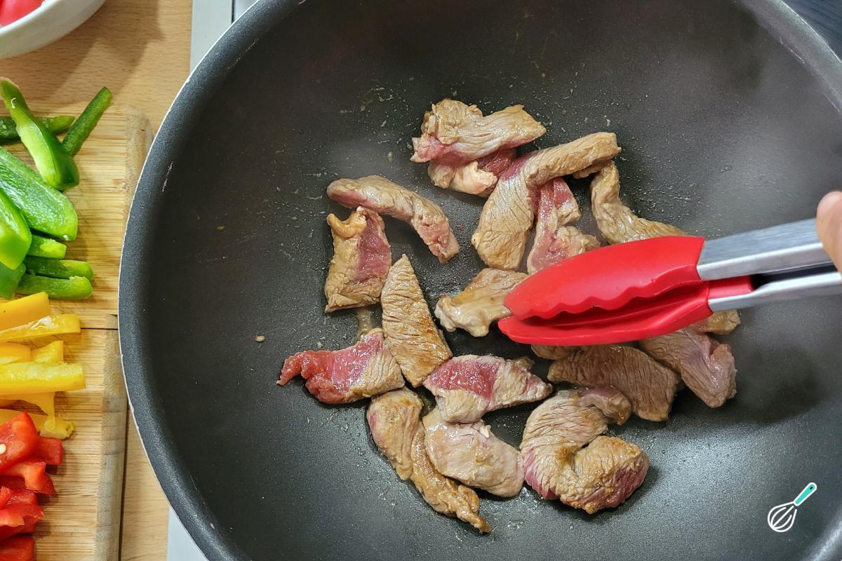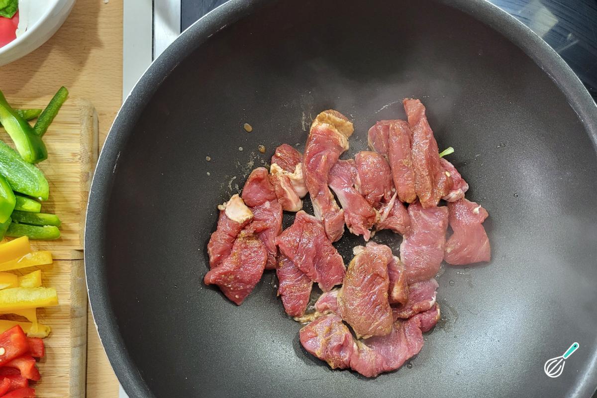 Leve a carne para dourar em uma frigideira com o óleo de gergelim. Como tudo será feito em uma frigideira, escolha uma grande em que caibam os vegetais.